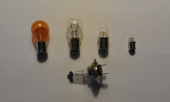 Lámpara de incandescencia: Formadas por un filamento, una ampolla de cristal al cual se le ha aplicado un vacío o se le ha aplicado un gas inerte como argón. Funciona a base de corriente eléctrica que calienta el filamento y éste produce luz. Tienen muchos usos como en luces de posición o pilotos traseros y su temperatura de color es baja. Las formas de las bombillas varian dependiendo de dónde se vayana colocar, como por ejemplo el plafón interior que se trata de una bombilla alargada.