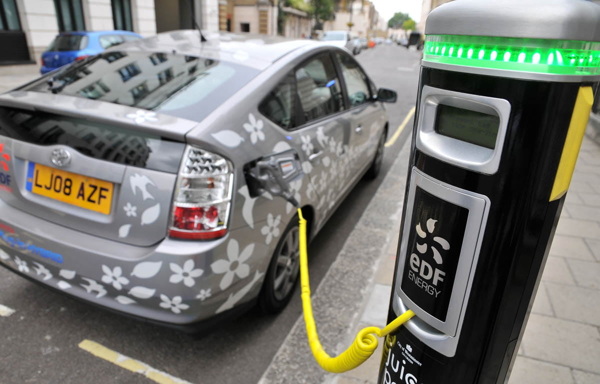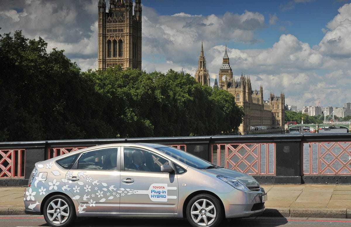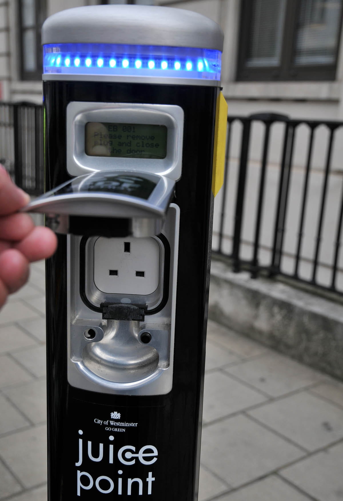 Además han creado una infraestructura temporal de postes de recarga eléctrica como se ve en la foto superior tomada en Westminster, equipados con un display informativo y el característico conector trifásico. Sobre la parte superior, una luz en verde indica que se está cargando y en azul que está disponible para la carga. A simple vista, un Prius recargando electricidad asemeja a un coche corriente repostando gasolina.