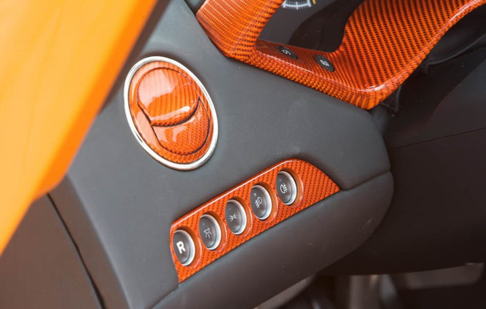 La auténtica y constante relación de IMSA con la fibra de carbono despunta en el GTR Spyder, desde los añadidos en negro situados por toda la carrocería (branquias en el frontal, alerón, suelo de las estriberas, etc) hasta las inserciones en el interior en color naranja, despuestas en botoneras, cubierta de la consola del conductor, toberas del aire, etc. A juego, unas oscuras llantas en color negro brillante y una tapicería de cuero con costuras en naranja y acolchados en asientos y reposabrazos central.