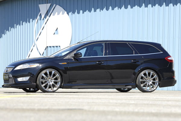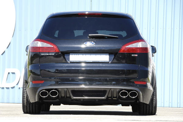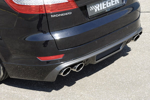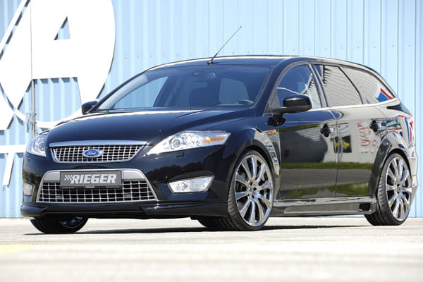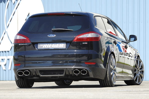 Rieger Tuning apuesta por las terminaciones llamativas para la berlina familiar Ford Mondeo Sportbreak. El color negro ayuda en parte a distinguir un acabado más fiero, aunque son los tradicionales accesorios los que marcan la diferencia.