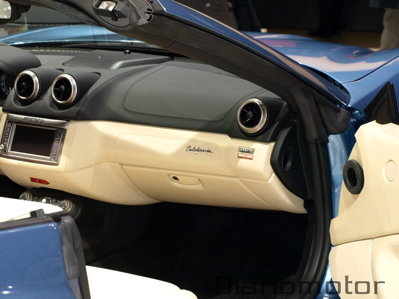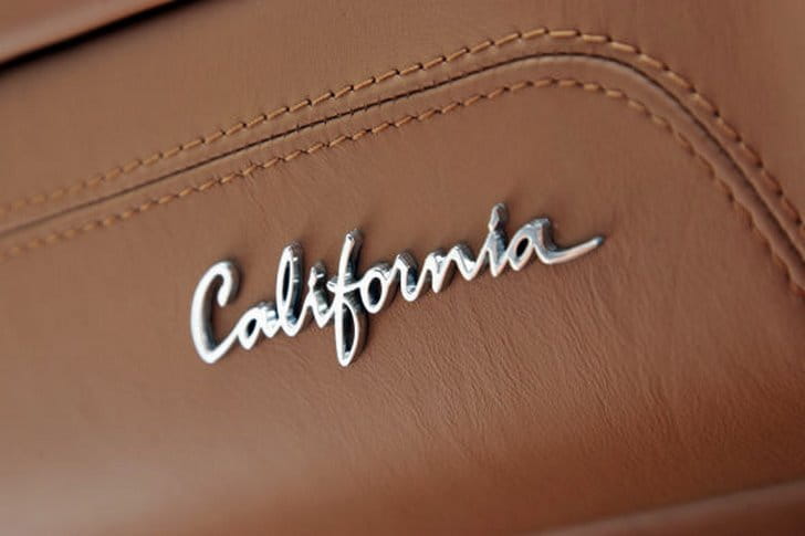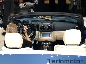 El modelo descapotado que se apreciaba mostraba un interior en color crema con la combinación del gris en el salpicadero. Los detalles cromados se extienden desde el navegador central hasta las toberas del aire, al igual que la tipografía California como signo de distinción. Tan a la altura de un Ferrari como su cockpit, sencillo en el tacómetro pero alegre en su velocímetro: 340 km/h de marca tope y más o menos 200 km/h en la vertical. Me llamó la atención lo bien que le queda la ocultación de todas las lunas cuando la capota se encuentra abierta.