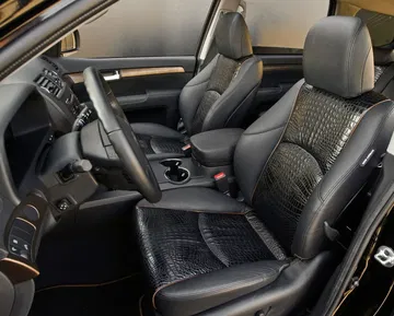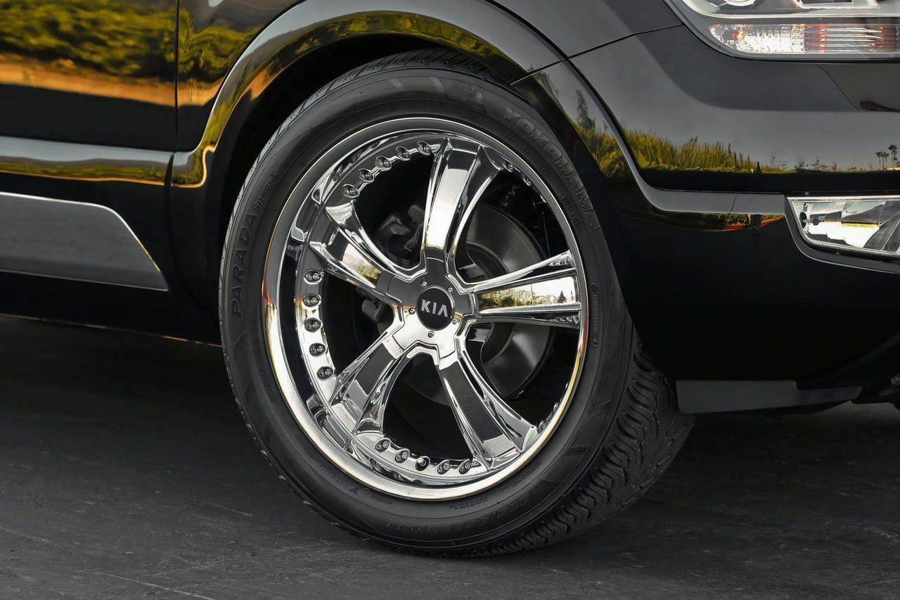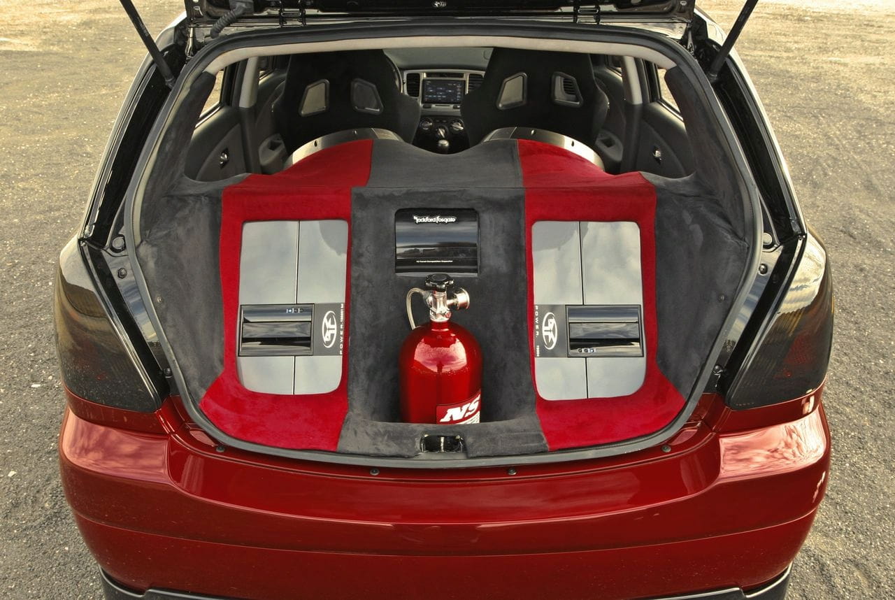 Las llantas y las ruedas las firma TSW y Goodyear respectivamente, aunque pasan más desapercibixdas al apreciar el Rio5 de puertas para adentro. Los asientos han sido reemplazados por baquets deportivos en el eje delantero, desapareciendo además las plazas traseras a favor de un enorme equipo de audio con múltiples altavoces y control de la etapa de potencia desde el maletero. Para este modelo, Kia se apoyó en el preparador Mobis Parts de Los Angeles.