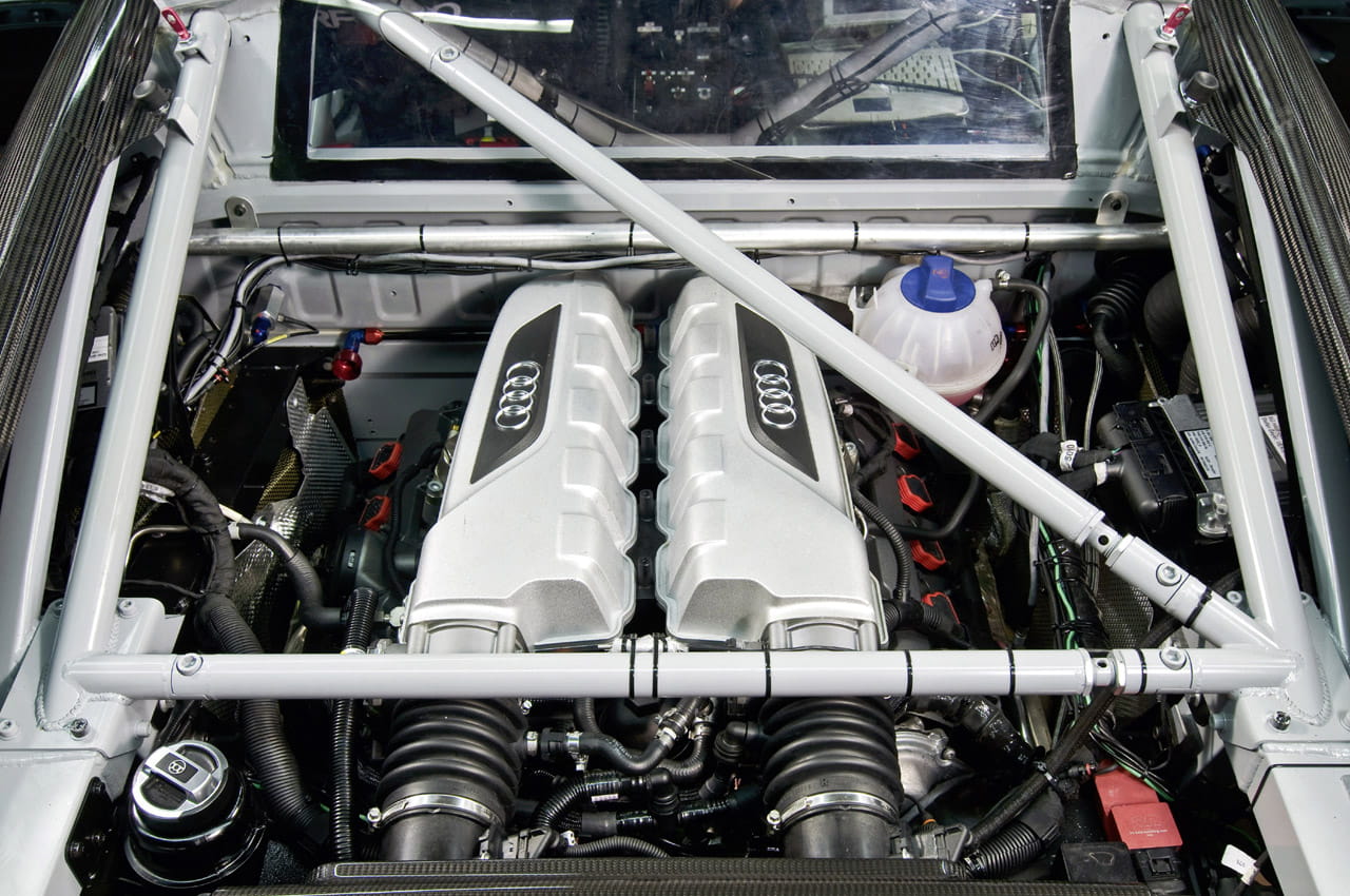 Para el R8 GT3 se abandona la tracción integral por requisitos de la categoría GT3 por lo que hablamos de un bólido de tracción trasera equipado con un motor V10. Audi no ha publicado detalles sobre el propulsor, debería ser de aspiración atmosférica y se declaran más de 500 CV para la versión de competición. Todo hace pensar que sea un derivado del 5.2 V10 FSI de los Audi S6 y S8. También se estrena caja de cambios secuencial de 6 velocidades.
