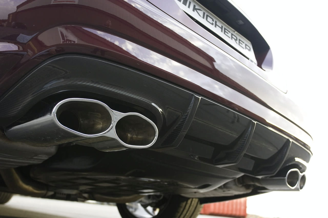 La reducción de peso experimentada empieza directamente desde la parte en contacto con el suelo, con unos nuevos neumáticos colocados sobre llantas de aleación ultraligera Kicherer RS-X en una medida de 20” y anchura superior en el eje trasero. Pero el predominio de material por detrás de la chapa lo aporta la fibra de carbono, presente desde la parte baja del vehículo en forma de spoiler hasta el difusor trasero, las estriberas laterales o las tapas de los retrovisores exteriores. Los últimos cambios estéticos llegan de la mano de una parrilla más suave y de una cuádruple salida de escape que promete un sonido atronador.