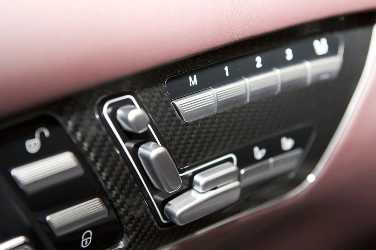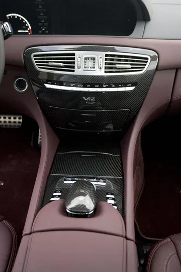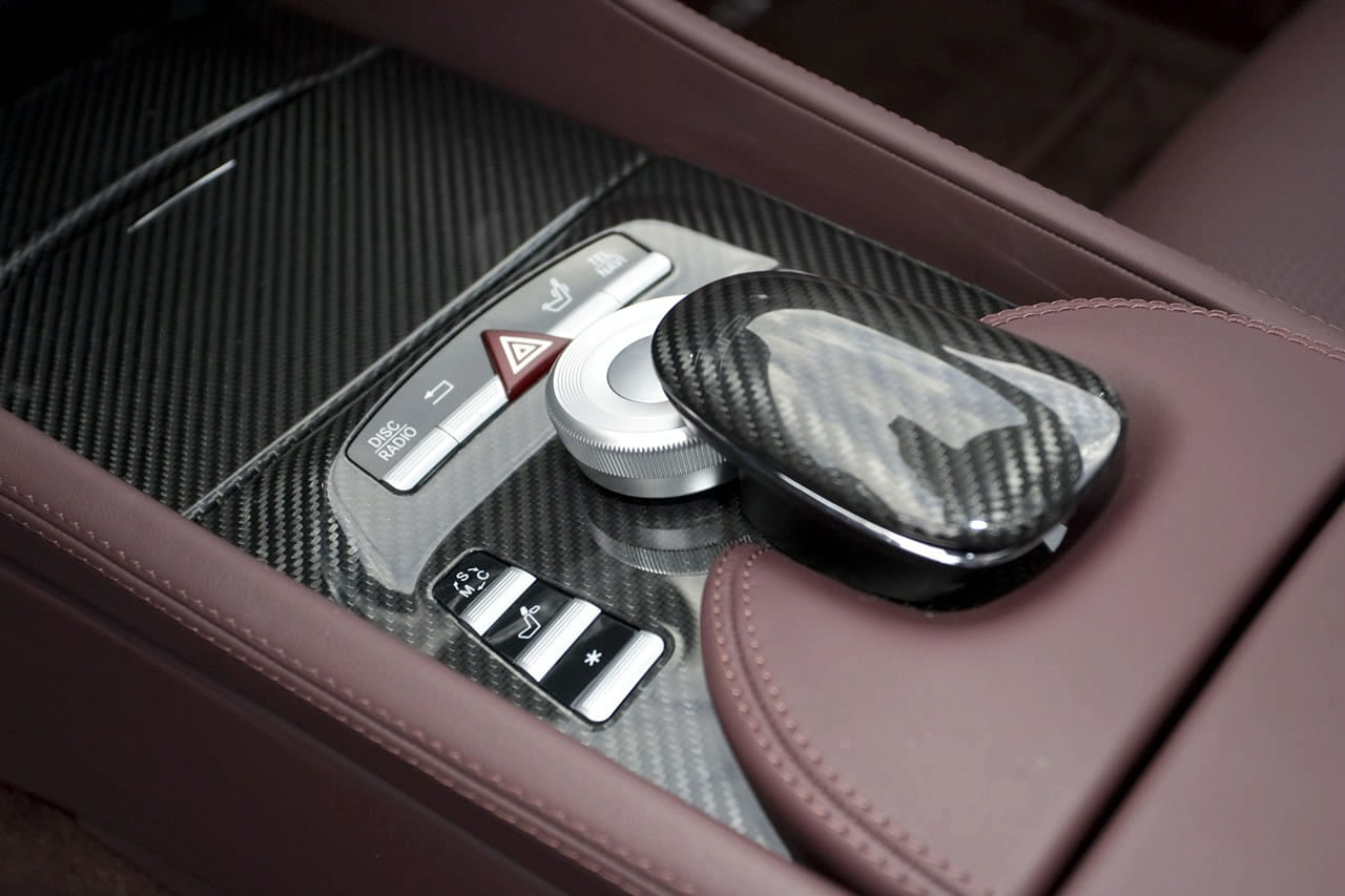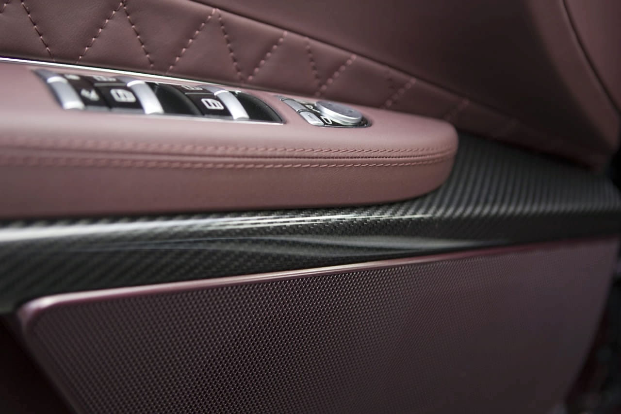 El interior se sitúa muy acorde con los exteriores del habitáculo, sobre todo en cuanto al mismo color “vino” y al uso masivo de la popular fibra. Esta está presente esencialmente en la columna central del salpicadero y como un caro embellecedor de las puertas, aunque no está sola si hablamos de grandes materiales. Otros como la Alcantara, visible por ejemplo en el techo, o la Nappa, que aumenta el valor de los asientos, aportan el toque de calidad buscado. El detalle final llega de la mano de las alfombrillas fabricadas a mano con una pelusa especial.