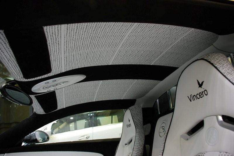 El Vincero está literalmente bronceado en todas sus partes. Y ligero como nunca pues sufre un enorme “contrachapado” de fibra de carbono que afecta incluso hasta el techo o los pliegues laterales en forma de punta. Para la parte delantera el capó y la “fachada” incorporan este magno material, aunque quizás destaca más a la vista la “V” metalizada que lleva estampada en la parte más baja de la calandra. El aspecto desgastado de los tonos bronce es visible también en las llantas de aleación, que tienen un aire a las montadas en el Pur Sang.