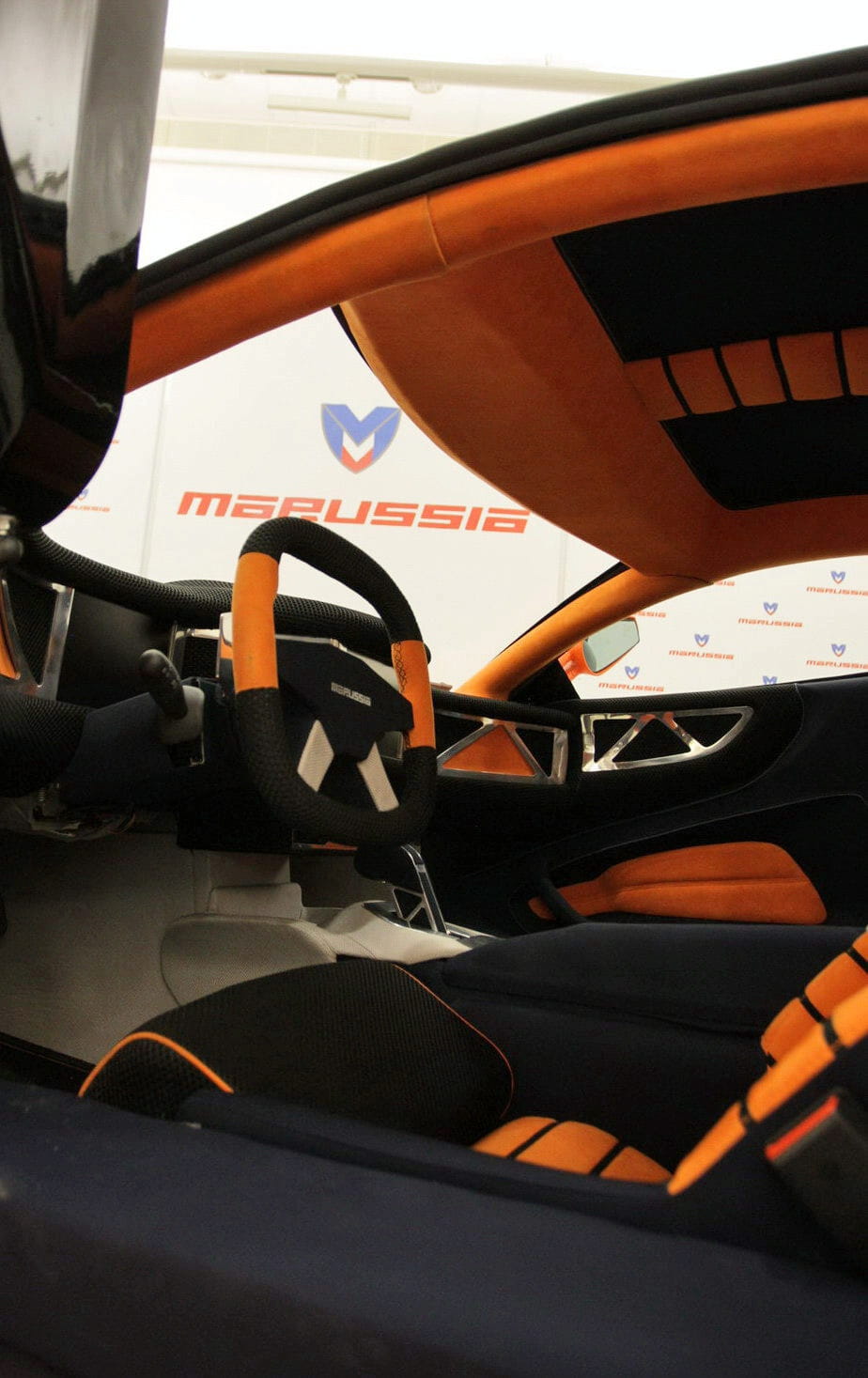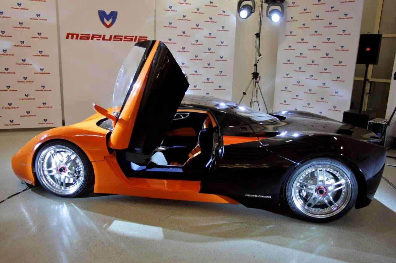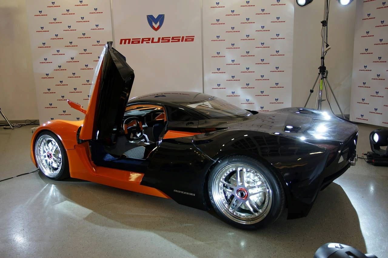 Resulta difícil comparar al Marussia con otros deportivos, pues tiene toques de muchos y una peculiar combinación. Es un biplaza con cabina central, a la que se accede a través de puertas de tijera, y conformado por una línea baja. Su “morro” aerodinámico de gran pendiente deja lugar a las integradas ópticas delanteras y a las toscas entradas de aire, mostrando un aire de simplicidad. La zaga se eleva por encima de la línea media y termina en formas muy originales con flechas de luces, doble escape central y un difusor de radicales medidas.