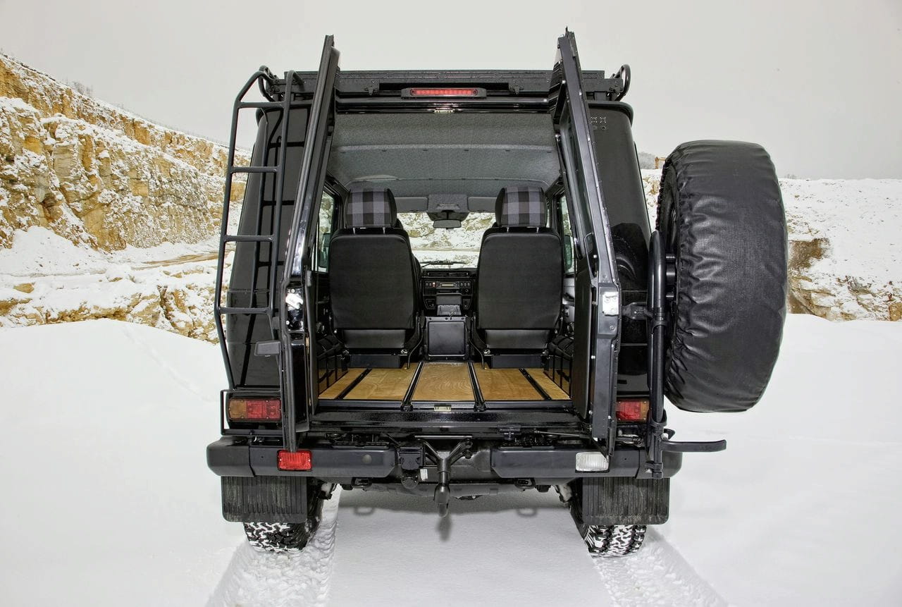 La tapicería de serie se sustituye por otra compuesta de un material sintético resistente a todo tipo de tratos, las alfombrillas pasan a ser de plástico, de fácil limpieza y alta resistencia, aperturas de drenaje en el piso y controles resistentes al agua. Además, se instala un potente sistema de calefacción auxiliar, así como un aire acondicionado manual de alta potencia. Está claro que sus futuros dueños no le harán 60 km de autopista y lo guardarán en el garaje, hablamos aquí de todoterreno extremo y profundos vadeos.