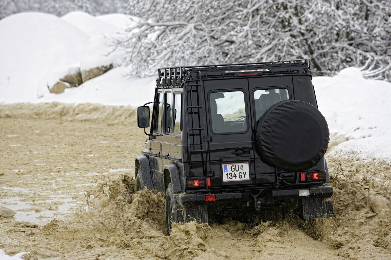 En modo completo de ataque campero el G cuenta con neumáticos todoterreno 265/75 R 16, llantas de aluminio, protectores flexibles de los pasos de rueda, protecciones para los faros, escalera de aceeso a un techo apto para carga y un gancho de remolque en la parte delantera, útil en el no demasiado probable caso de que nos quedemos atascados. El habitáculo recibe un tratamiento funcional similar, con la sustitución de elementos de lujo por otros diseñados para soportar un duro trato.
