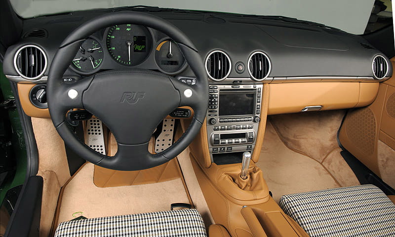 En el interior, como puedes ver, lo más llamativo es la tapicería de tela de estilo campero. También llama la atención el pomo de la palanca de cambios, de reducidas dimensiones, si bien dado que tan sólo hay una marcha no tendremos apenas que actuar sobre el mismo. El volante es el típico de la firma RUF y la instrumentación se ha adaptado para la ocasión, mostrando los diversos indicadores del sistema eléctrico además de la velocidad.