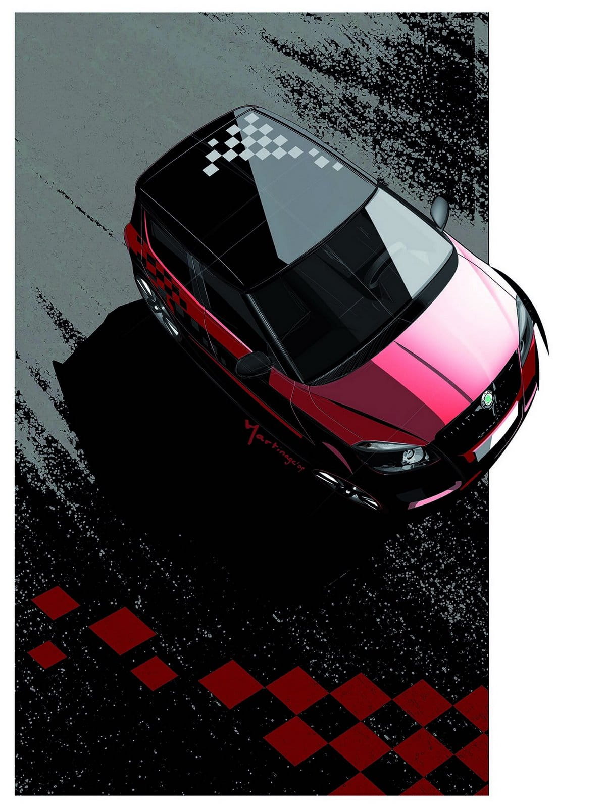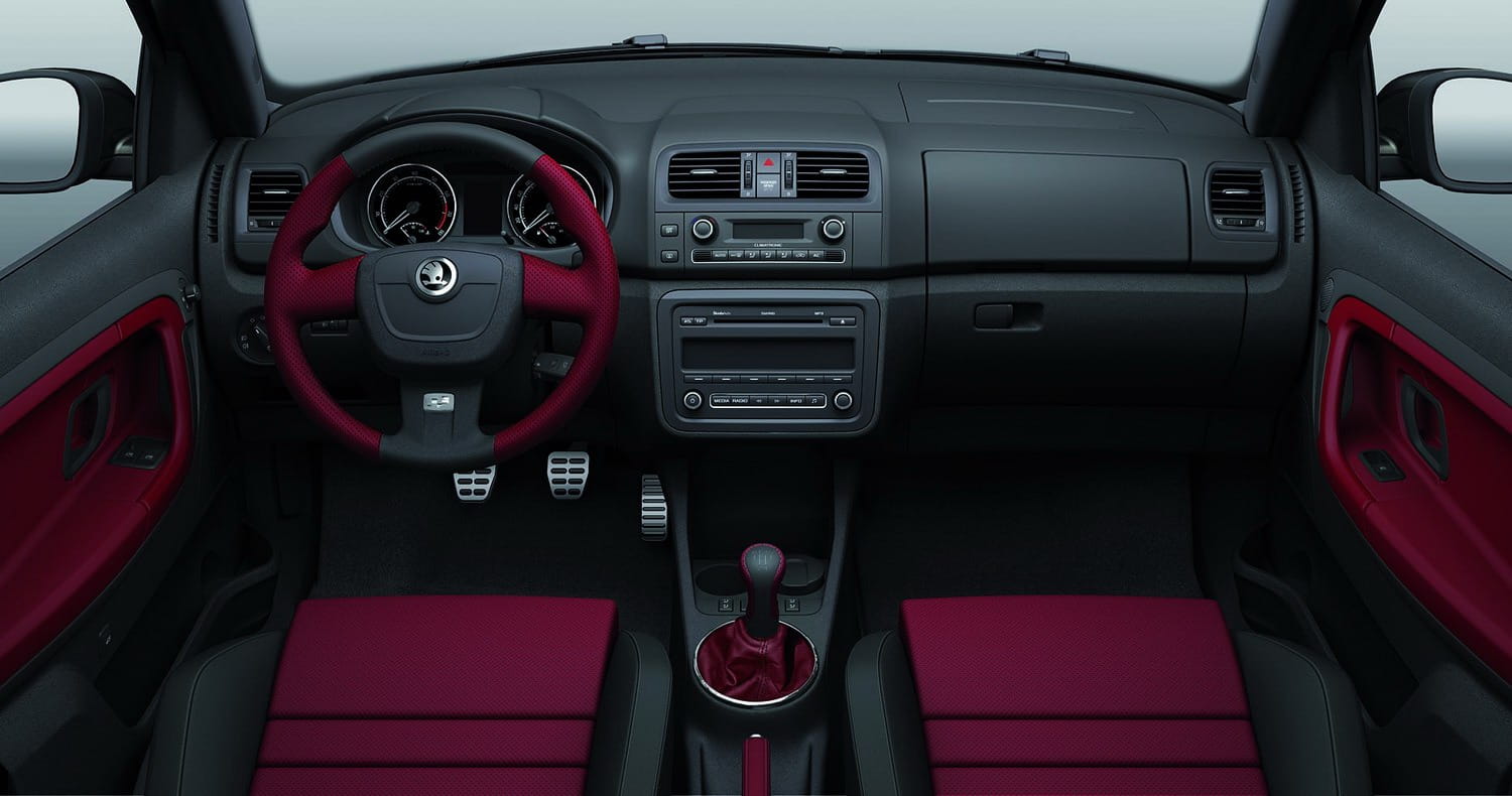 Este prototipo muestra un Fabia adornado por una pintura roja brillante y partes en negro, como los huecos de aire a lo largo de la carrocería, el techo, los embellecedoras o las bonitas llantas de aleación. Múltiples radios decorados en una oscuridad brillante y con un reborde rojo en los neumáticos que las hace más dinámicas a la vista. La dualidad se mantiene en el interior con un rojo más apagado para el tapizado de piel de los asientos deportivos y en los paneles de las puertas. Un volante distintivo en cuero con la insignia RS en la base o los pedales en aluminio lo distinguen de otros Fabia.