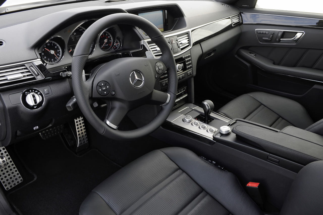 En el habitáculo se sustituyen los asientos de serie por asientos deportivos, forrados en cuero de varias tonalidades – bordados con el logotipo del preparador – que también se extienden a a las molduras y partes del salpicadero. Los pedales son de aluminio y las estriberas retroiluminadas dejan ver el logo de AMG al abrir las puertas. Sin entrar al interior a un no entendido podría costarle diferenciar la versión AMG de otros Clase E, pero las dudas se le despejarían cuando escuchase el bronco rugido del motor al arrancar.