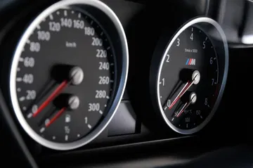 Al acceder al amplio habitáculo descubrimos los emblemas de Motorsport en los vanos de las puertas y al sentarnos al volante la impecable instrumentación. Esta cuenta con retroiluminación blanca y es específica para los X5 M y X6 M. La línea roja es variable, en mi opinión un elementos que debería ser de serie en todos los coches, ya que así se evitarían muchos sustos derivados de exprimir la mecánica en frío, un error bastante frecuente a evitar. A medida que se caliente el motor la línea roja sube.