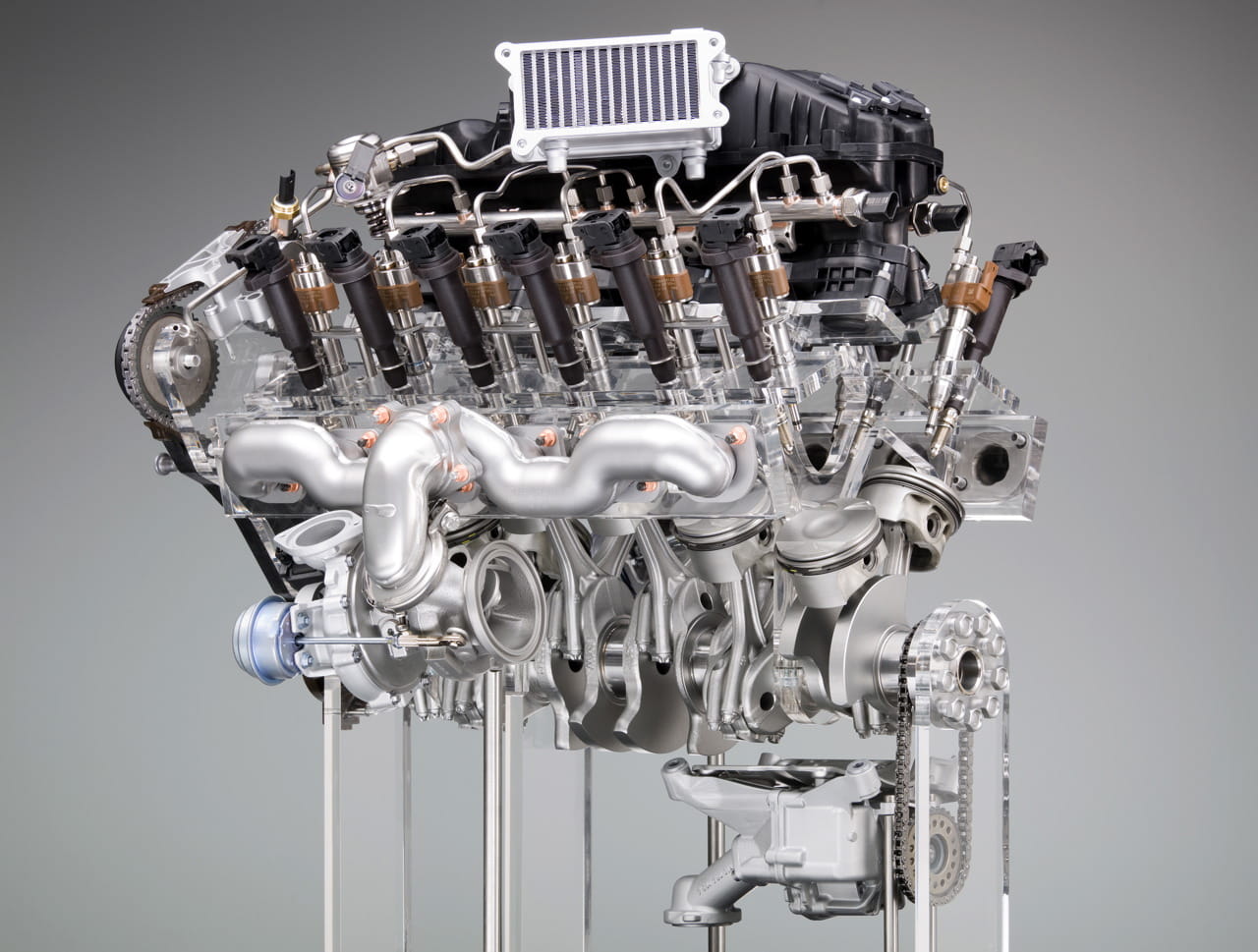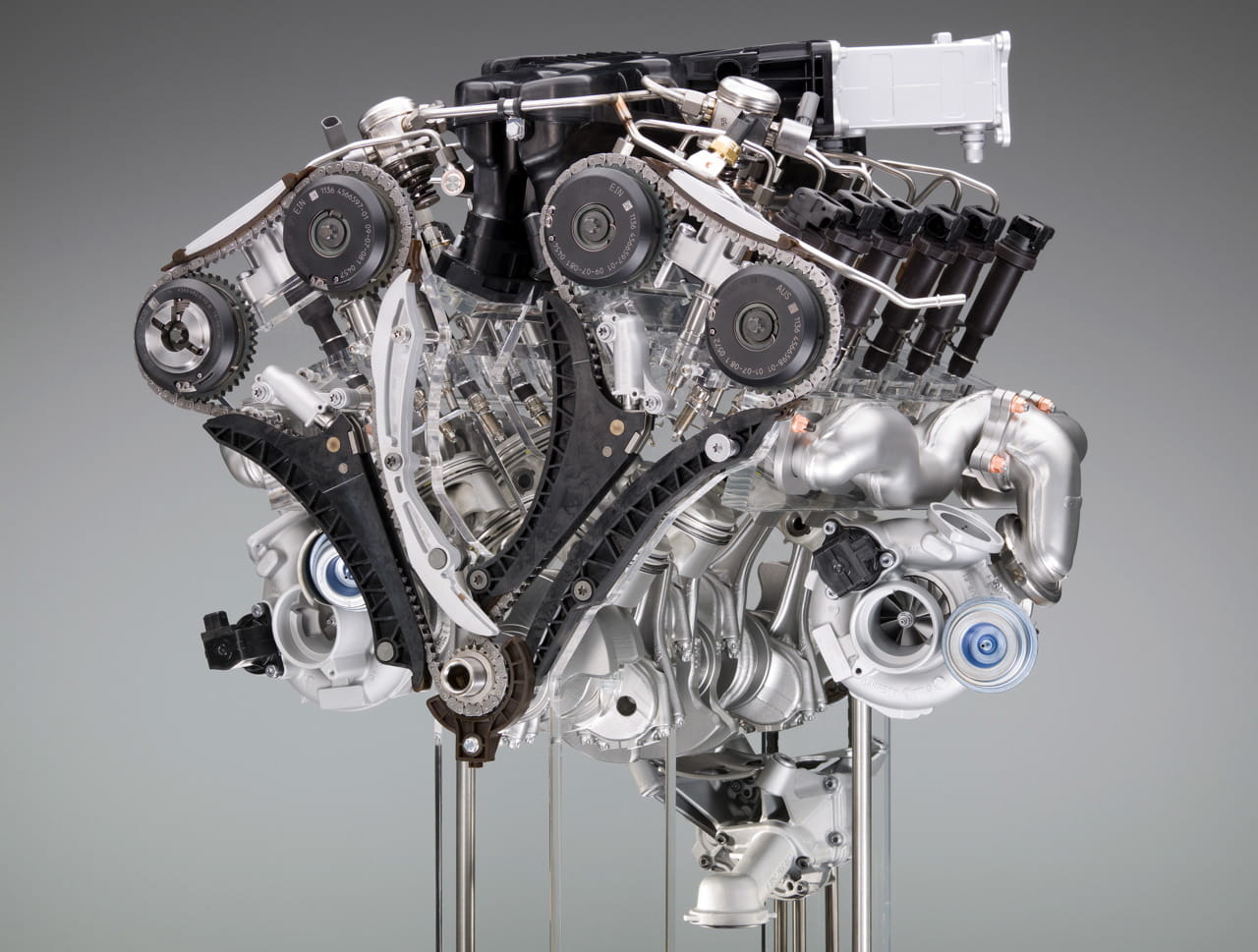 Pero sin duda lo más destacable es su sistema de doble turbocompresión en serie, asegurando una respuesta lineal y contundente del motor, muy generoso en par máximo. Apoyado por un intercooler agua-aire y una bomba de aceite de presión variable el motor logra una potencia máxima de 544 CV a 5.250 rpm y un par máximo de unos grandes 750 Nm entre 1.500 rpm y 5.000 rpm. Consigue acelerar de 0 a 100 km/h en unos impresionantes 4.6 segundos y su velocidad máxima está autolimitada a 250 km/h.