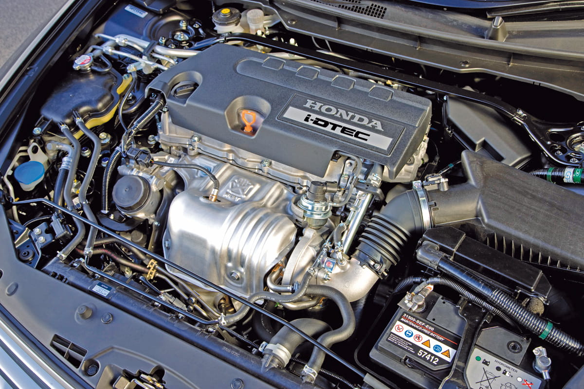 Está construido enteramente en aluminio, tanto el bloque como la culata, y su funcionamiento es extremadamente suave y progresivo, al ralentí apenas suena a diésel. Sus prestaciones son muy correctas, a pesar de que el Accord pesa 1.615 kg, 95 kg más que el Mazda6. Acelera de 0 a 100 km/h en 9.7 segundos y su velocidad máxima es de 212 km/h. Toda la potencia pasa al tren delantero a través de una caja manual de seis relaciones, de accionamiento preciso y recorridos muy cortos.