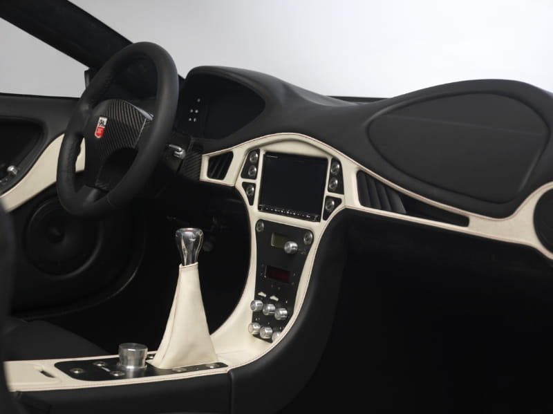 Como biplaza cuenta con un interior lleno de contrastes con el blanco y el negro como bandera y un diseño futurista, conformado con un uso de mandos metalizados muy simples y una pantalla en la consola de piloto que sirve de punto central de control. El cuero y la fibra de carbono se funden para definir un tacto especial en los butacas deportivas, en el volante, etc.