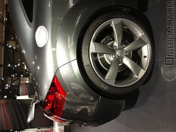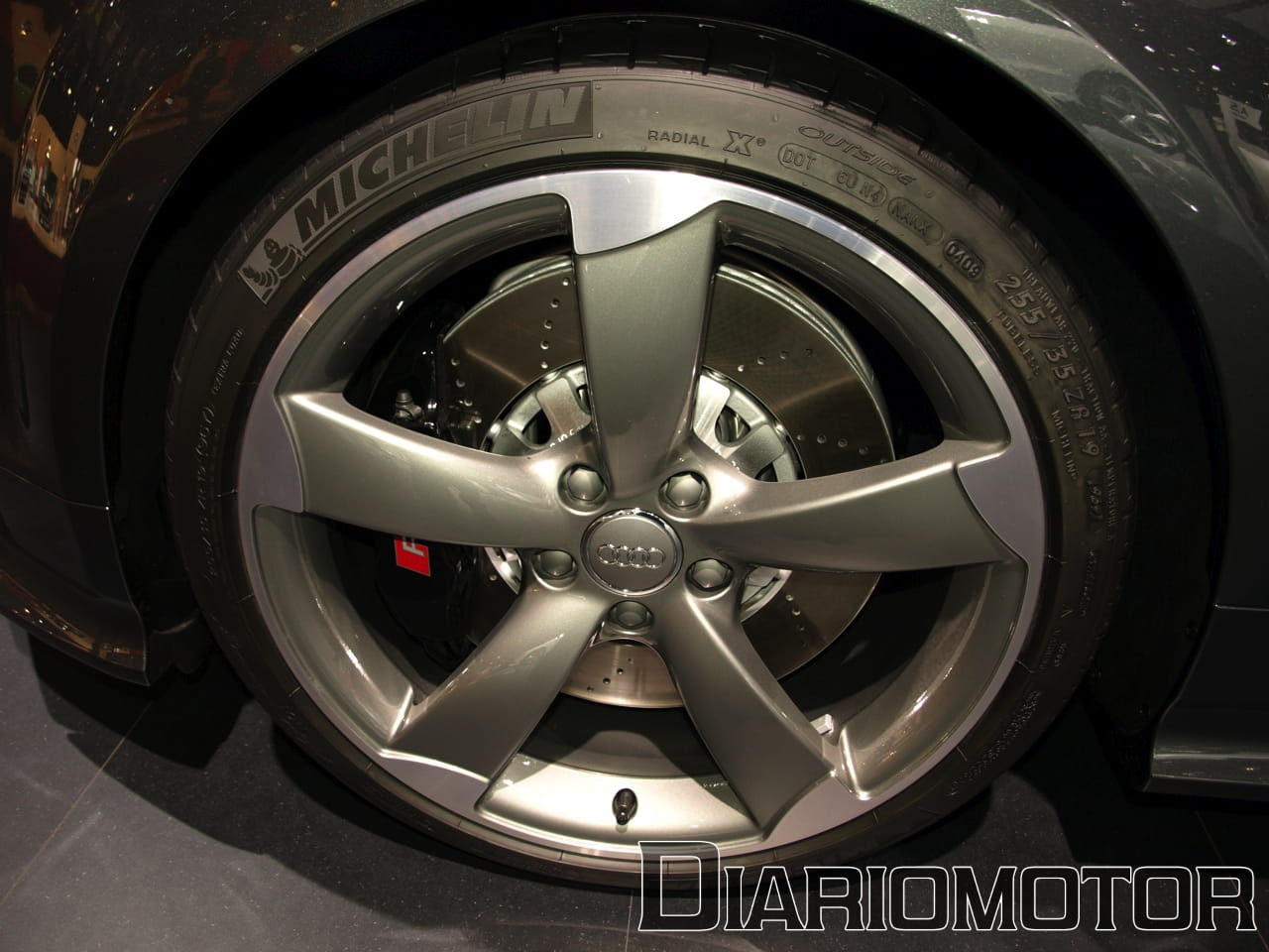 En una primera aproximación el Audi TT-RS, sin llegar a ver la hermosa chapita roja de la parrilla que indica que no es un TT convencional, ya obtenemos las señas con su particular paquete aerodinámico. La parte frontal, llena de belleza con sus luces LED y spoilers salientes invitan a avanzar por su físico para apreciar todas sus dimensiones. El TT-RS del salón estaba vestido con un color gris daytona efecto perla y unas llantas de aleación de generosas dimensiones y cinco radios.