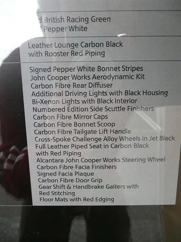 Al kit aerodinámico del Mini John Cooper Works se le han realizado modificaciones sustituyendo algunos plásticos por fibra de carbono con el objetivo de aligerar el conjunto y darle un aspecto racing, en piezas como los retrovisores, el difusor trasero, la entrada de aire sobre el capó, los embellecedores y las manillas de apertura de las puertas laterales y del portón trasero y sobre los paneles y el salpicadero en el interior.