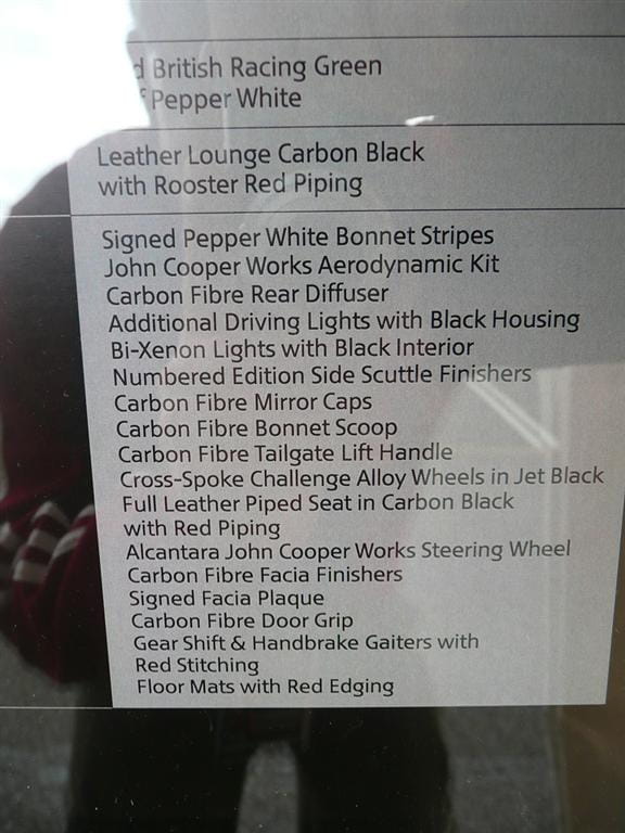 La mecánica permanece inalterada con el famoso motor 1.6 twin-scroll turbo que desarrolla una potencia máxima de 211 CV y un par máximo de 260 Nm. La mayoría de cambios respecto al JCW de serie son los que conciernen a su estética, destacando el color exclusivo verde British Racing Green de la carrocería, un completo kit aerodinámico y multitud de detalles que hacen de esta Edición Especial un auténtico objeto de deseo para los fans de este clásico.