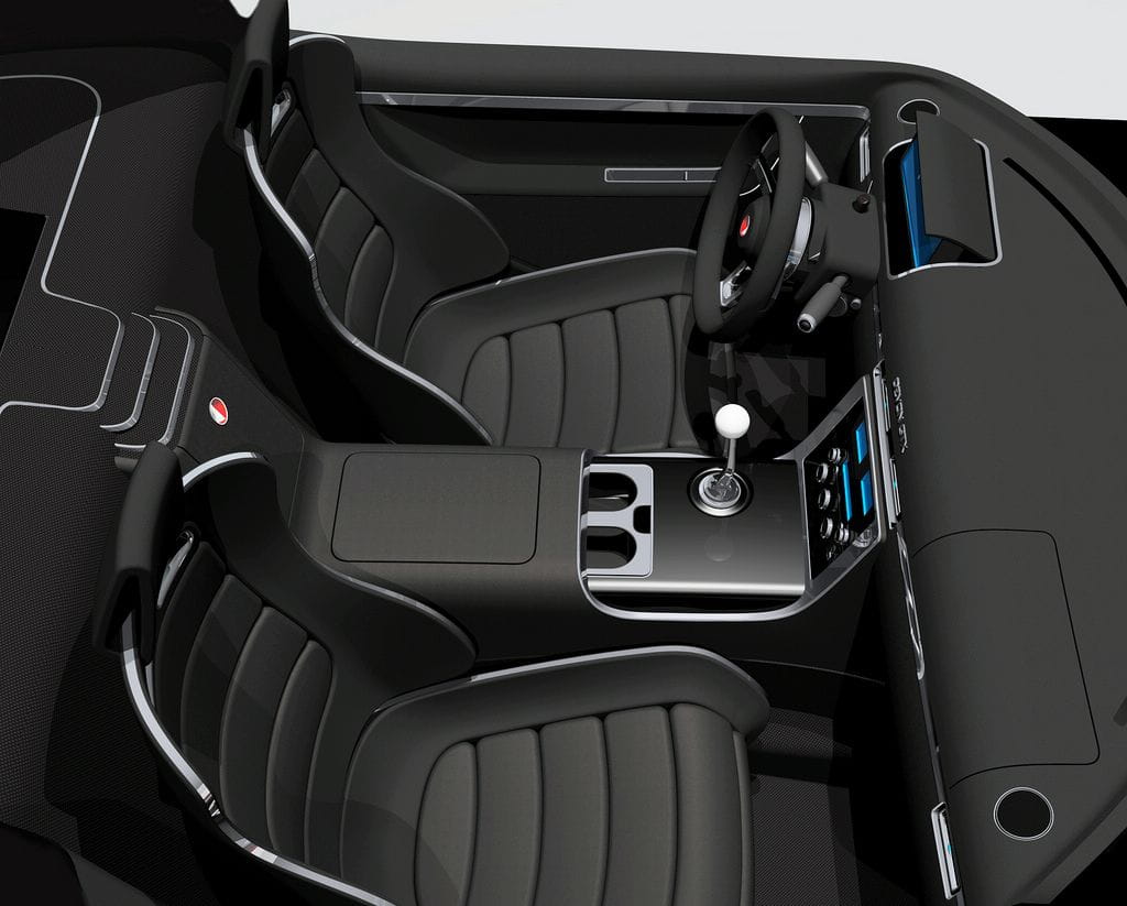 El GTX juega además con un techo semi-transparente que aportar iluminosidad aunque quien más favorece a este aspecto es el sistema de apertura de las puertas en ángulo de 45º verticales. Una vez en el interior el recorrido de conductor y acompañante es mínimo, no es un coche para grandes viajes desde luego. En estas imágenes realizadas por ordenador el diseño y la instrumentación del salpicadero tiene un regusto muy clásico mostrando incluso displays analógicos.