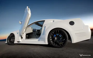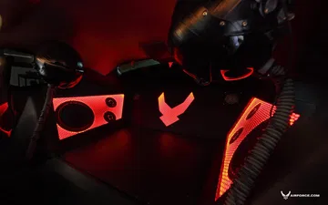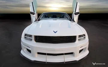 Empecemos por el Ford Mustang X-1. El color blanco inmaculado de la carrocería contrasta con las enormes llantas oscuras Volk, creando una poderosa estampa visual. Muchos potenciales soldados quedarán admirados por su carrocería sumamente ensanchada y el agresivo kit aerodinámico. Abriendo las puertas tipo Lamborghini nos damos de bruces con un habitáculo espartano a más no poder. Está basado en el puesto de pilotaje de un caza de combate, y por tanto cuenta con las mismas comodidades que este.