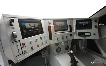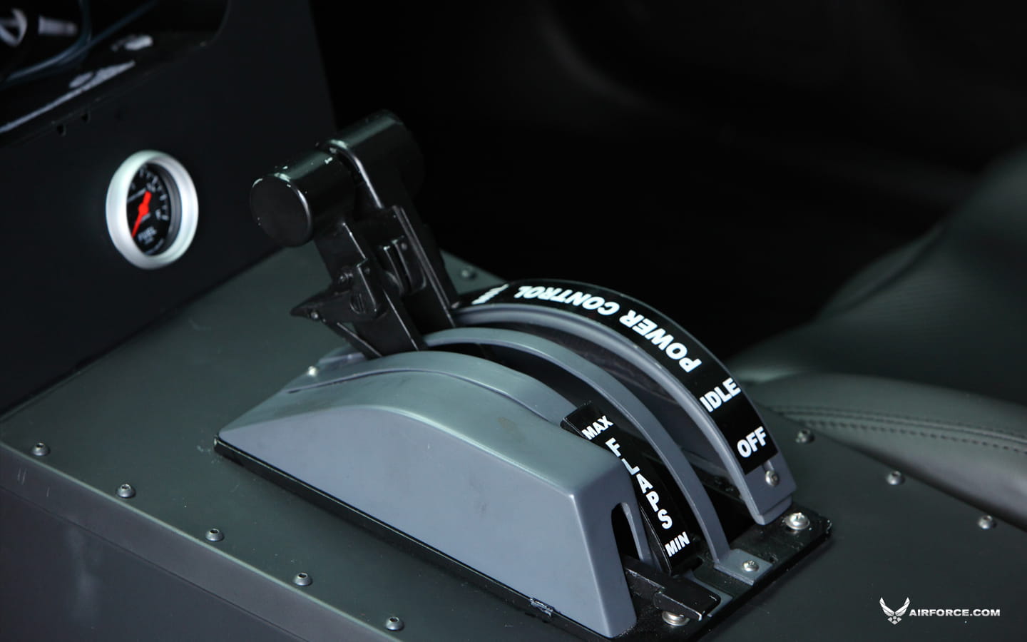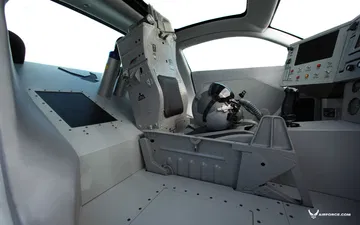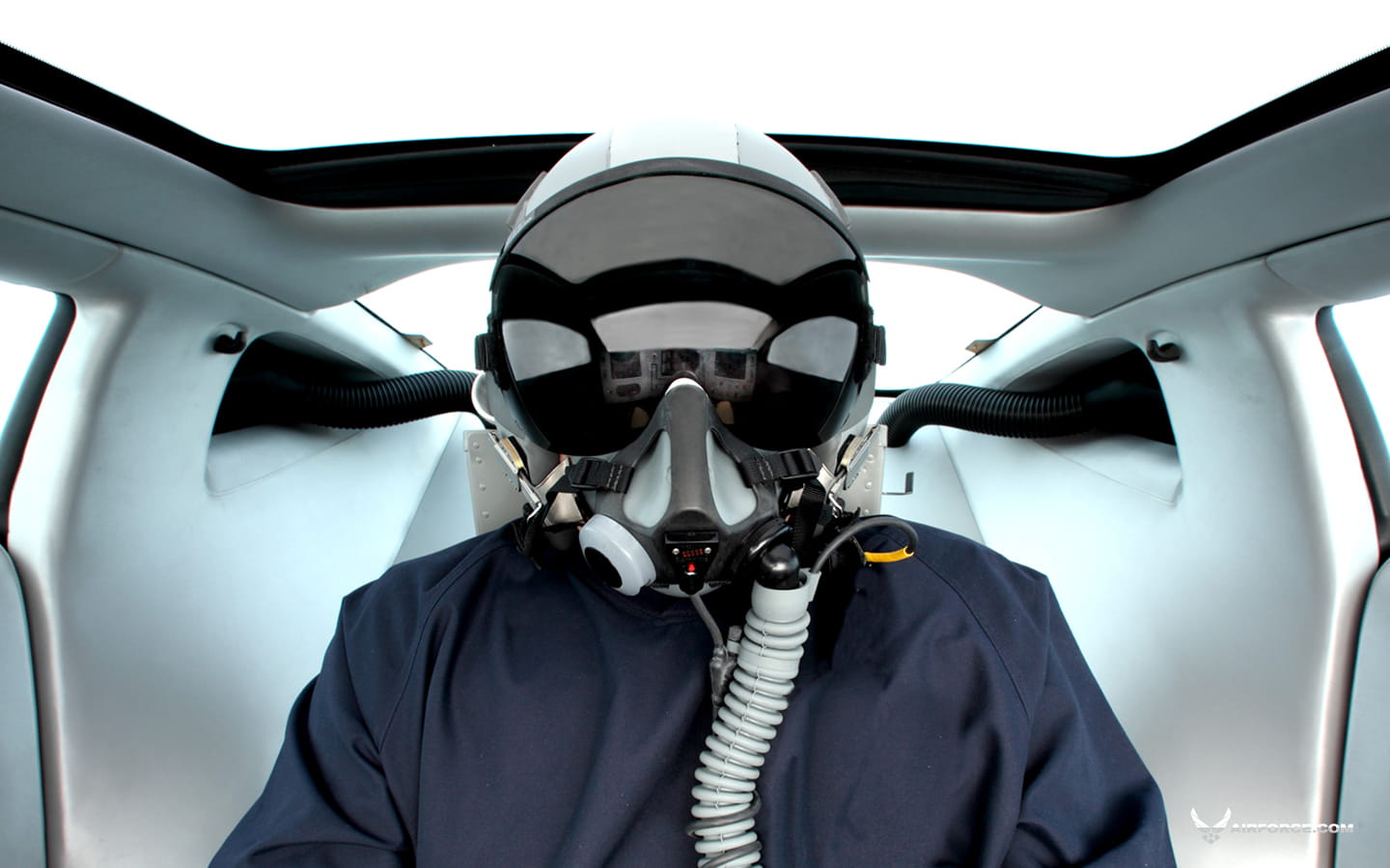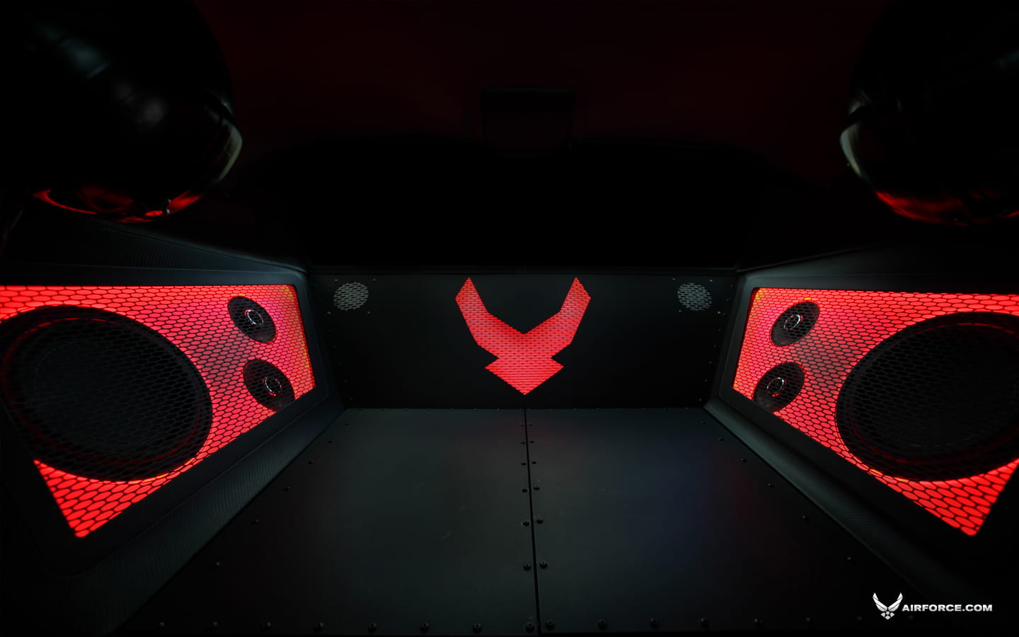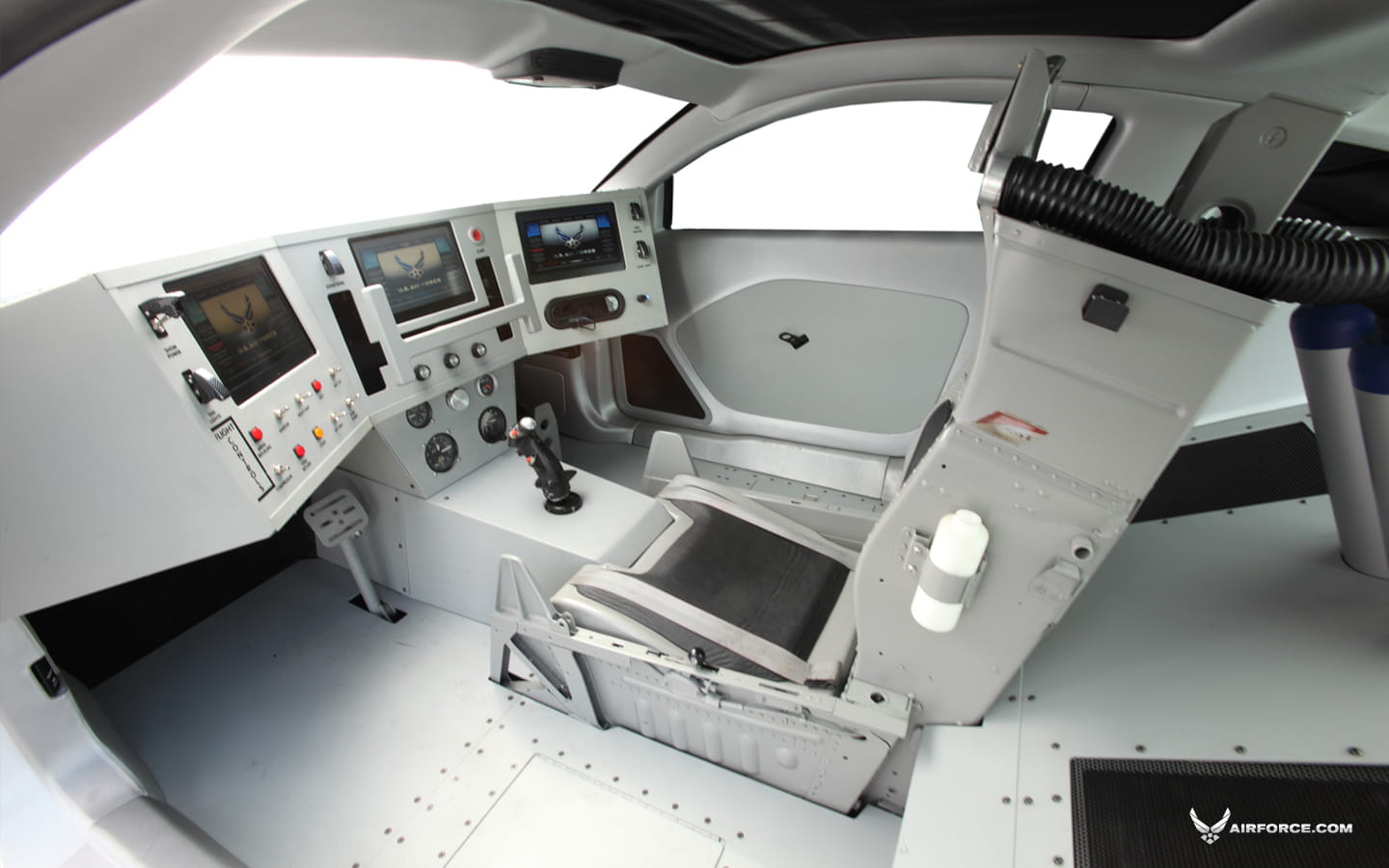 Las cuatro plazas del Mustang se susitutuyen por un único asiento, ubicado en el centro del habitáculo. Este asiento es de tipo eyectable, y es funcional con lo que habrá que tener cuidado con qué botón del panel de instrumentos vamos a pulsar. A disposición del piloto, multitud de pantallas informativas e incluso una cámara de reconocimiento térmico. Conducir el coche puede ser algo más complicado, los pedales están uno a cada lado del túnel de la transmisión y su volante emerje de la consola central.