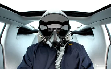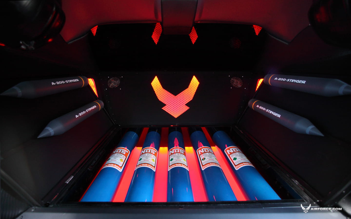 En el habitáculo el puesto de “pilotaje” es algo más convencional, pero sólo por el hecho de que tiene un volante más o menos convencional y una palanca de cambios, disimulada como el control de propulsión de un jet. El piloto – que tiene que identificarse por un escáner biométrico antes de entrar – puede accionar un visor térmico, cámaras con un alcance de un cuarto de milla que cubren 360º y un modo de silenciación de los escapes para pasar tan inadvertido como un coche eléctrico.