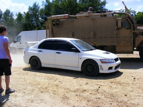 Entre las imágenes que se han filtrado podemos ver el Mitsubishi Lancer EVO VII blanco antes y despues de que un proyectil impactase sobre el techo y lo convirtiese en un Lancer EVO “Targa”, el helicóptero que probablemente causó los daños sobre el EVO, un gigantesco vehículo acorazado y varios soldados uniformados con ropa de camuflaje.