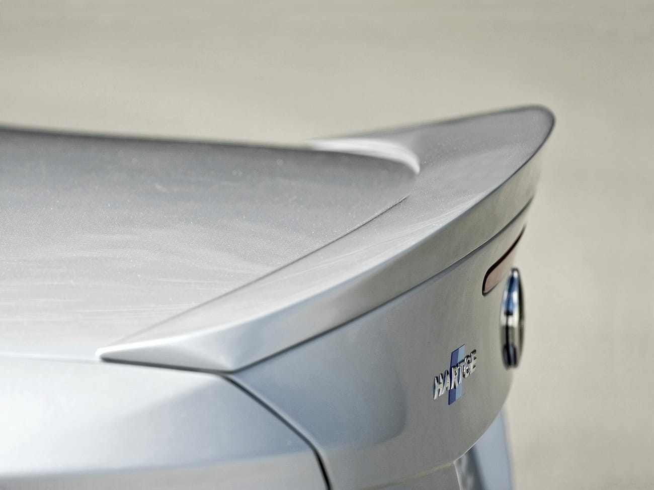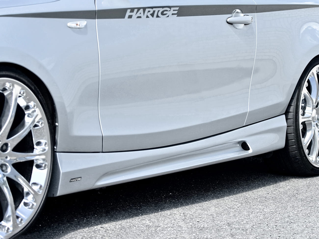 El cuerpo del Serie 1 puede mejorarse con un nuevo spoiler frontal más sobresaliente que resalta las ventilaciones laterales, aunque es la rejilla central de entrada de aire la que se modifica realmente incluyendo dos pilares. No parece una solución eficiente a nivel aerodinámico y, personalmente, no le veo demasiado sentido. Para el perfil del modelo alemán se reservan unos faldones inferiores más anchos y una serie de pegatinas Hartge por si además de pagar quieres hacer una publicidad gratuita.