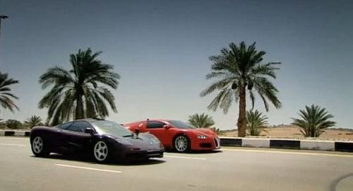 En el último episodio de Top Gear pudimos ver un duelo entre dos de los mejores superdeportivos de la historia: el superlativo Bugatti Veyron y el mítico y exclusivo McLaren F1. De ninguno se han producido más de 300 unidades y ambos cuestan más de un millón de euros actualmente. Nuestros británicos favoritos han viajado a Dubai – el paraíso de los superdeportivos – para enfrentar a estas obras maestras de la ingeniería en un duelo de aceleración de una milla.