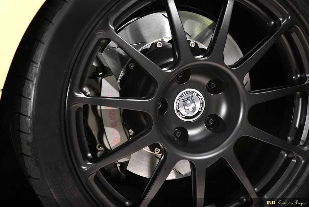 Le siguen el juego sus calzas, unas llantas de aleación HRE Monoblock de 18 pulgadas enganchadas a unas gomas Nitto NT05 275/35/18. A partir de este punto comienza un trabajo exclusivamente centrado en redondear el comportamiento del chasis del M3 que de por sí es de los mejores. Con tal objetivo se une un kit de suspensión KW Clubsport con amortiguación ajustable y un completo equipo de frenos Brembo con discos de 36.5 y 34.5 cm de diámetro y pinzas en color gris oscuro.