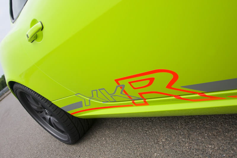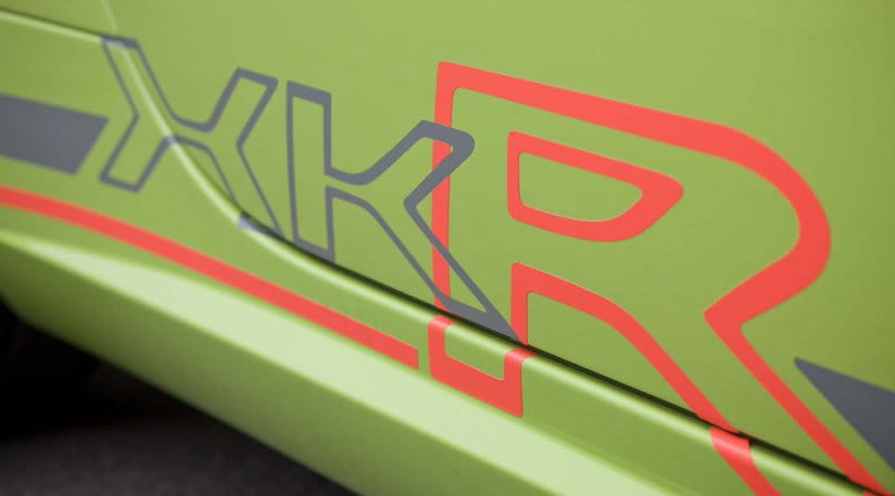 El XKR Goodwood Special Edition se reconoce a la primera de cambio por su estética exterior, bastante alejada de lo que podemos imaginar en un Jaguar. El exterior está rematado con una pintura en color verde lima con una serie de acentos en “grafito satinado” en los respiradores para los frenos, en las luces delanteras, en las cubiertas de los retrovisores, en los marcos de las puertas o en la banda lateral con la “R” en color naranja. Es una combinación que luce pero que no estamos acostumbrados a ver en los modelos ingleses.