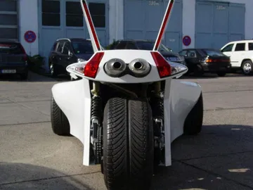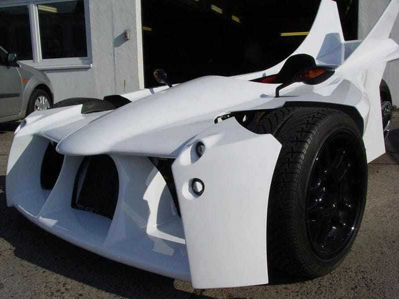 Su carrocería es de material compuesto, y posee un diseño cuando menos extravagante. El frontal está trufado de entradas de aire, los faros son pequeños y agresivos. De perfil y desde atrás parece una mezcla entre una lanzadera espacial y un caza a reacción, por esas aletas traseras a modo de spoiler. Su longitud es de 3.2 metros y mide 1.8 metros de ancho. Por su estabilidad no deberíamos temer, el centro de gravedad es muy bajo y los neumáticos son suficientemente anchos, amén de disponer de suspensión con tarado deportivo.