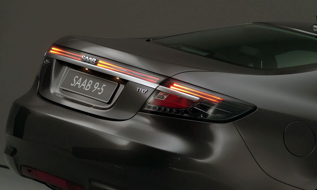 Por ejemplo podemos apreciar los retrovisores, con un marcado intermitente LED integrado. También podemos admirar el diseño de las ópticas traseras y la banda iluminada que las une, una característica de diseño muy poco vista. Llamativos son los pilares A, no están pintados del color de la carrocería, sino recubiertos de un material oscuro y brillante. Me ha parecido curioso el detalle de la motorización, en el portón del maletero aparece TTiD elevado a la cuarta, ¿podremos esperar un seis cilindros para el 9-5?