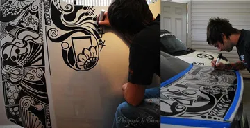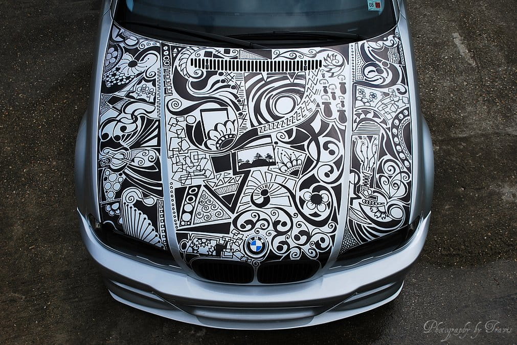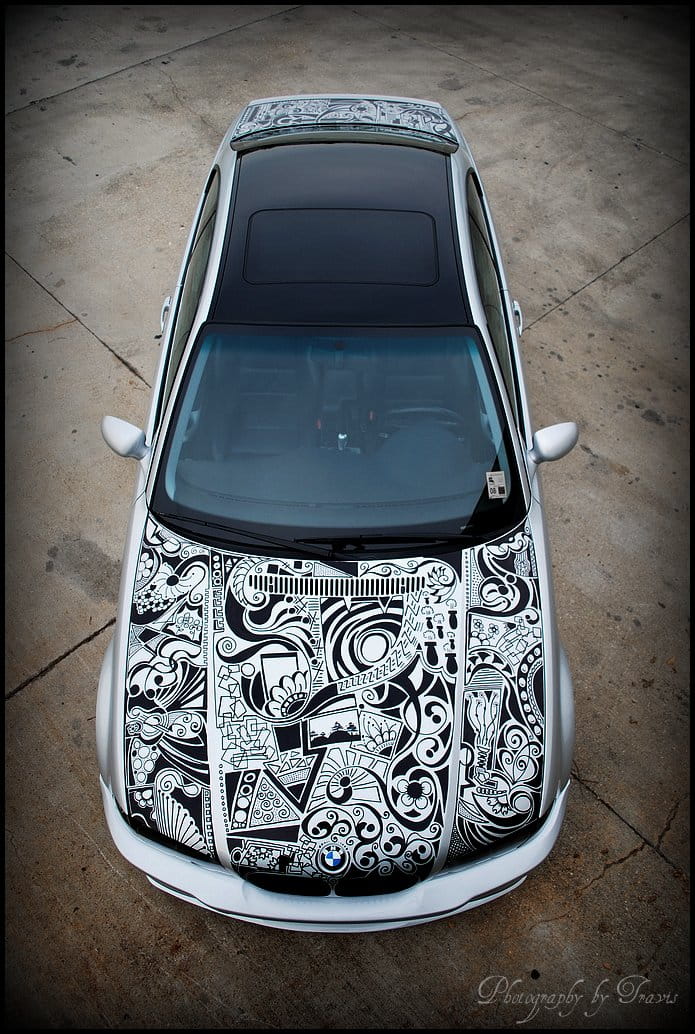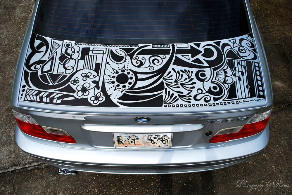 Para realizar el elegante trabajo tribal y floral sobre el capó y el maletero Travis invirtió, junto a su mujer, unas 12 horas para preparar el capó y realizar el pintado. Lo creáis o no está realizado completamente a mano y no se ha empleado ninguna guía o patrón, simplemente imaginación y un pulso que merece un premio. Después del pintado, dispuso una serie de capas de cera para proteger la pintura del desgaste, para que se pudiera lavar con jabón y resistiese mejor la acción de los rayos ultravioletas.