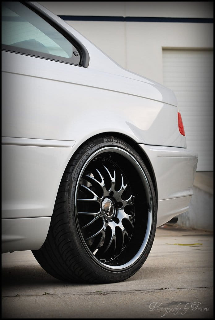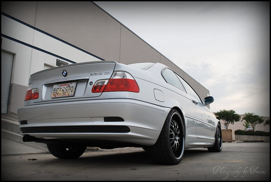 El 330ci de Travis no estaba precisamente de serie cuando comenzó a pintarlo. Entre otras cosas había cambiado un par de veces de llantas de aleación y las que poseía en ese momento eran unas Forte Phatty F23 de 19 pulgadas en acabado negro mate (el que se ve en las imágenes). Y tampoco era lo único que estaba diferente por fuera porque había instalado unas luces HID antiniebla, LEDs para las luces diurnas y para la matrícula, etc.