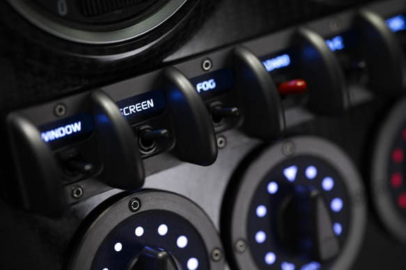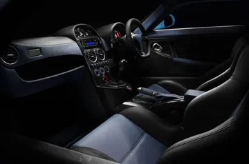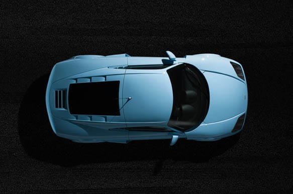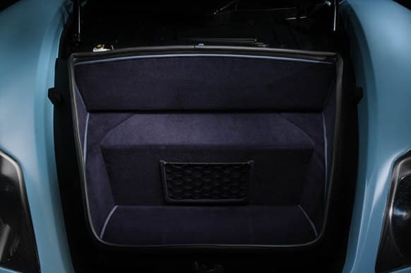 Junto al difusor funcional sólamente dos salidas de escape de tamaño mediano, curioso detalle. La combinación de colores elegida – azul para la carrocería y negro para las llantas – se replica en el habitáculo (habrá amplias posibilidades de personalización). No tiene un interior especialmente espectacular, pero hay detalles de calidad como un salpicadero forrado en cuero o auténtica fibra de carbono en la consola central. El equipamiento es bastante moderado, lleva climatizador, radio CD, espejos eléctricos y poco más.