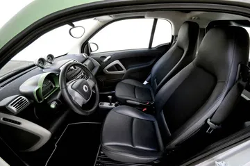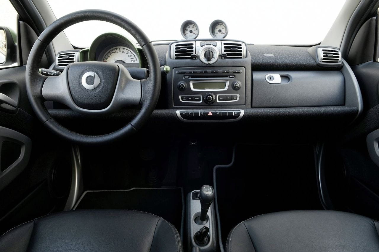 El aire acondicionado del Smart Fortwo electric drive extrae su energía de la batería, pero podemos pre-acondicionar el aire mientras el coche está conectado a la corriente en casa, evitando parte del gasto energético y aumentando nuestra autonomía. Estéticamente no es un coche diferente a cualquier otro Fortwo en las imágenes aparecen pintadas partes en verde pero imagino que habrá posibilidad de personalización. La instrumentación recibe un indicador de carga y energía recuperada.