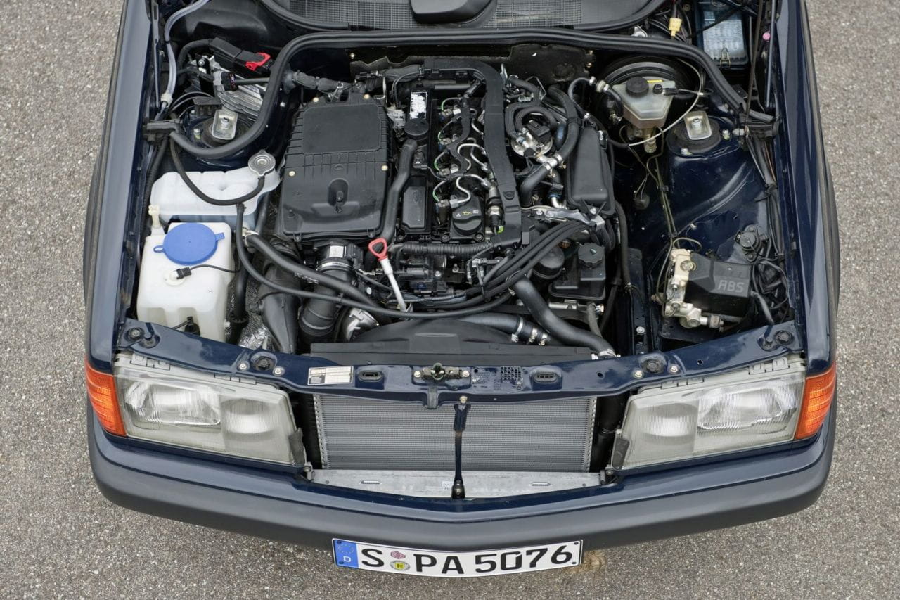 El OM651 es el turbodiésel 2.1 twin-turbo que podemos encontrar en los Mercedes E 250 CDI y C 250 CDI. Entrega la friolera de 204 CV a 4.400 rpm y un par máximo asombroso, 500 Nm entre las 1.600 y las 1.800 rpm. El espacio no ha sido el problema en los trabajos realizados en la bahía del motor, sino su adaptación al W201. Se ha empleado el cárter de una furgoneta Mercedes Sprinter o el diferencial trasero del Mercedes Clase C 320 de los años 90 (W203) entre otras modificaciones mecánicas.