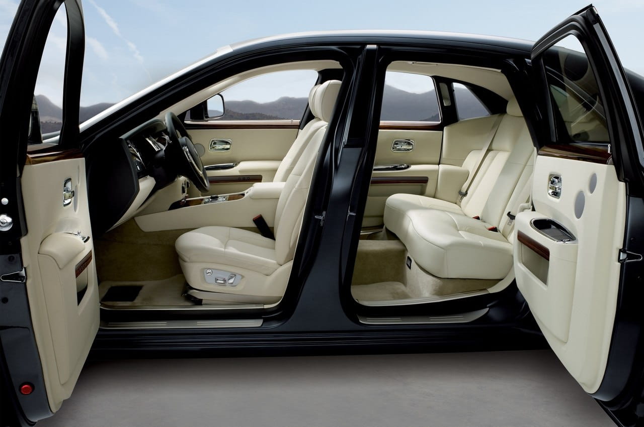 El nuevo Rolls-Royce Ghost estará disponible en 12 colores diferentes para la carrocería que contrasten con el capó delantero de color gris satinado y en el interior contará con unos acabados impecables empleando madera y piel en 8 colores diferentes para ofrecer un habitáculo tan acogedor como el de su hermano mayor el Phantom, por eso no se ha renunciado a detalles tan llamativos como las puertas suicidas (las puertas traseras se abren en sentido contrario a las delanteras).
