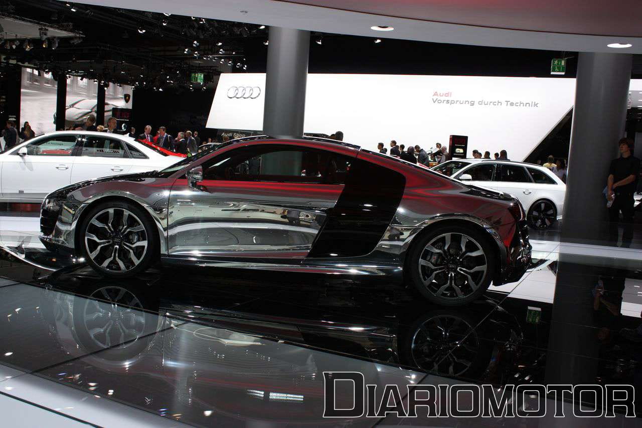 El Audi R8 V10 demostró que en persona es aún más impresionante que su predecesor con motor V8, ya sea por las nuevas llantas de 19” cuyos radios parecen haber sido diseñados especialmente para dejar ver las inmensas “paelleras” que lleva por frenos cerámicos, por sus entradas y salidas de aire de mayor tamaño o sencillamente por que una de las unidades que se exponía en Frankfurt lucía una carrocería cromada y sideblades negros.