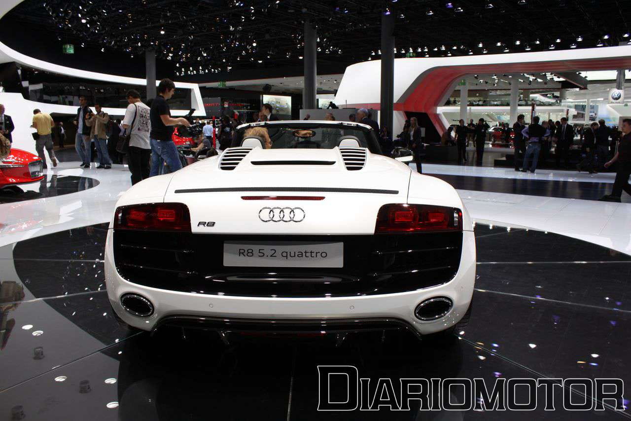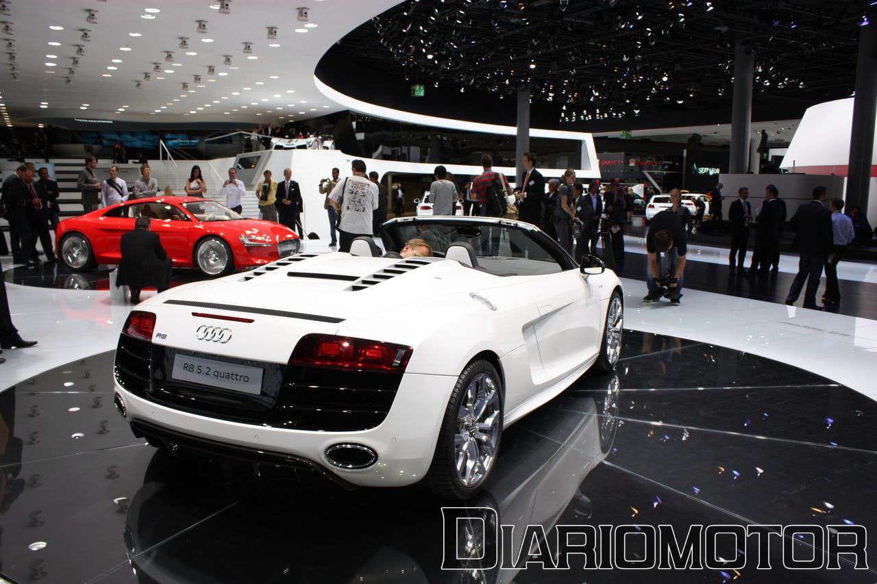 El nuevo Audi R8 V10 se mostraba por primera vez en las dos variantes que se comercializarán en los próximos años, por un lado la versión de carrocería coupé y la gran novedad en Frankfurt, el Audi R8 V10 Spyder con su flamante carrocería descapotable con techo de lona. El tercero en discordia el nuevo Audi e-tron, un prototipo de superdeportivo eléctrico que en un futuro podría amenazar la existencia de los deportivos alimentados con combustibles fósiles.