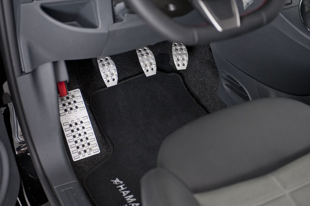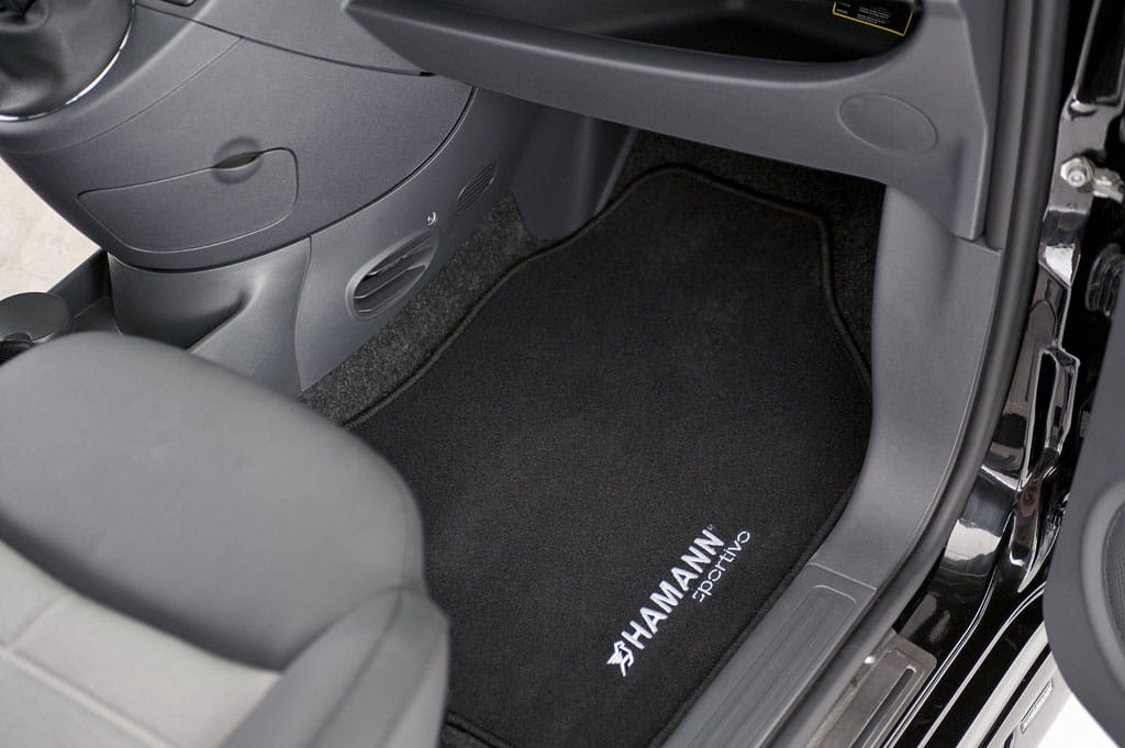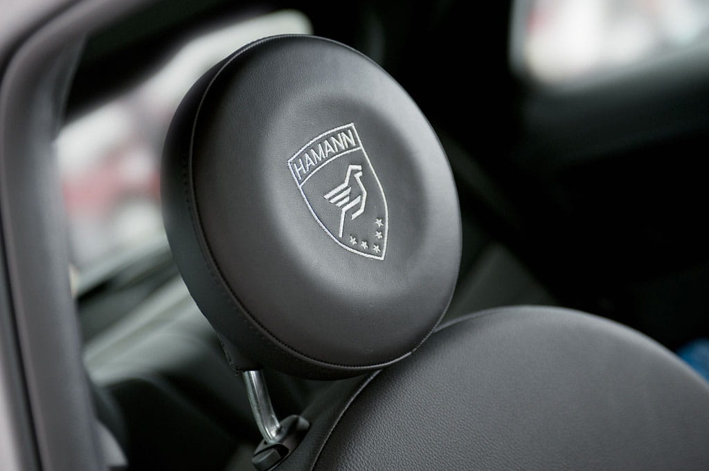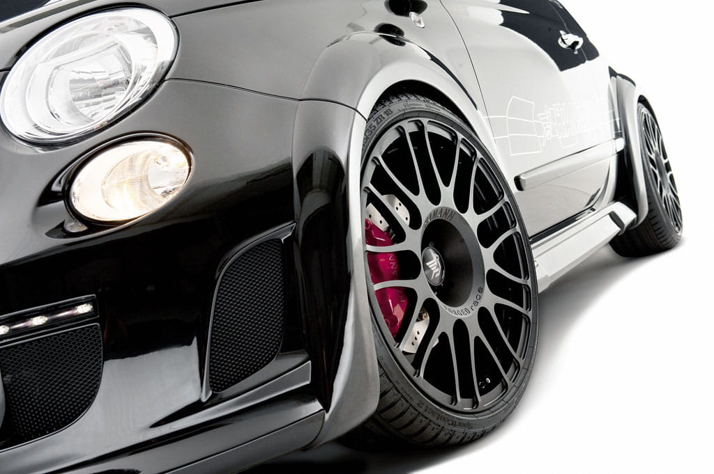 La elección de las ruedas va a juego con el resto y se ha dado un paso más. ¿Alguien decía que unas llantas de 18 pulgadas de diámetro para el Fiat 500 era exagerado? Pues aquí las tenéis junto a unos neumáticos con medidas 215/35 ZR18 y 225/35 ZR18. Más o menos a la altura de un compacto con unos aires ya deportivos. Una mirada al interior revela un buen rediseño: volante especial Hamann en cuero con costura en rojo, pedales de aluminio, alfombrillas de promoción y asientos con el bordado de “Hamann” en la cabecera.