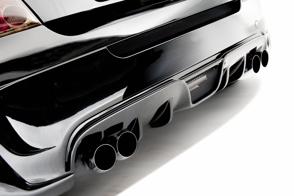 El Largo se viste de negro brillante y de un atuendo con muchas curvas, destacando los enormes pasos de rueda y los faldones delanteros. Justamente éstos parecen como una cuchilla de afeitar con varias capas y para quedar más bonitos llevan dos tiras de luces LED. Por atrás el parachoques y el difusor ganan unas rejillas y cuatro brillantes tubos de escape, por si no servían dos.