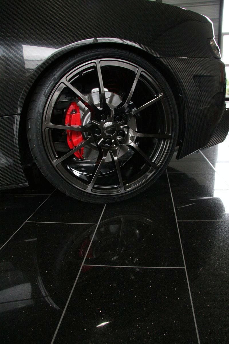 También se añade un sistema de escape deportivo en acero inoxidable junto a una suspensión rebajada de tipo roscado. Las llantas en color negro conjugan muy bien con el color original de la fibra de carbono, en medidas 9×20 pulgadas para la parte delantera y 10.5×21 pulgadas para el eje trasero, envueltas en neumáticos Dunlop Sport Maxx en medidas 255/30 ZR20 y 295/25 ZR21. Bajo las llantas, vemos las pinzas de freno pintadas de color rojo, a juego con el interior.