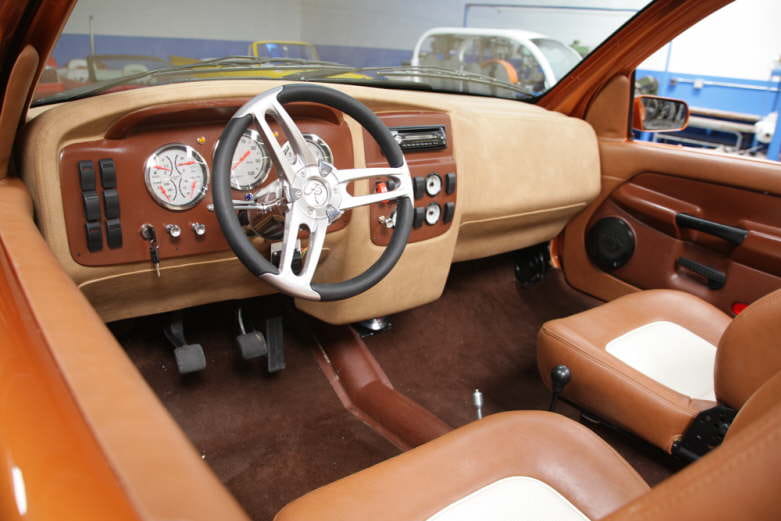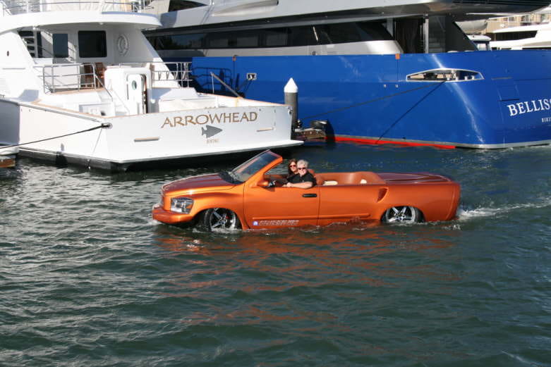A la vista está que parece una pick-up descapotable, con una carrocería elevada para mantener a salvo la base de flotación. Como única protección sus ocupantes tienen el parabrisas y como asientos dos en la parte delantera y una especie de sofá confortable en la parte trasera, que cobra más sentido cuando vas confortablemente por el agua. El acabado tiene cuero y la mayoría de cosas útiles como un radio CD elemental (que parece fuera de lugar).