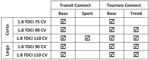 La gama Connect, que abarca tanto a la Transit como a la Tourneo, incluye ahora la posibilidad de elegir entre tres motores, dos carrocerías y tres niveles de acabado: Base y Sport para la Transit Connect y Base y Trend para la Tourneo Connect. Los motores son tres versiones del bloque 1.8 TDCi ya visto, que entregan 75, 90 y 110 CV de potencia máxima. La gama se configura de la siguiente manera: