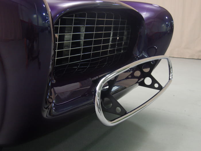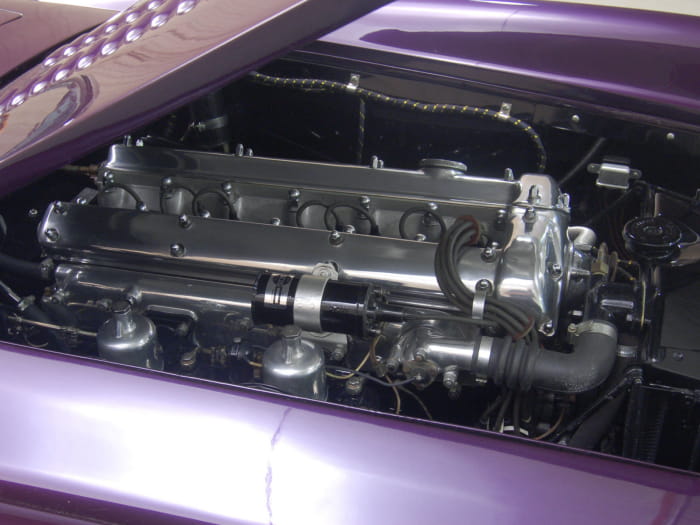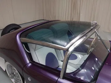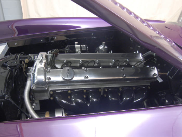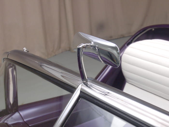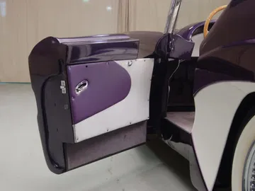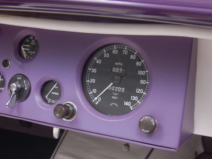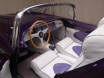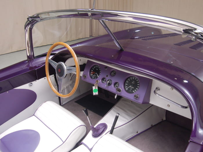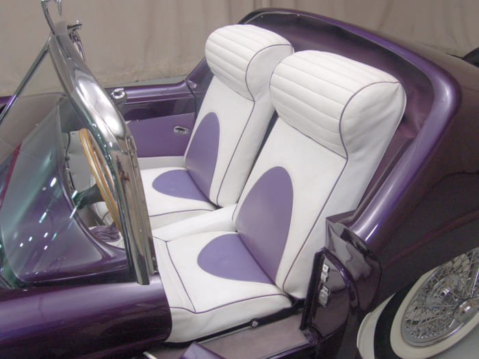 El interior es de lo más in de la época aunque se nota que lo han restaurado. Va desde el extremo de la sencillez, con el cuadro de mandos lleno sólo de indicadores, hasta lo más trabajado: los asientos. Son de cuero, a juego con el blanco y el violeta del resto del coche, pero lo más interesante de cada uno es su curvatura para recoger al pasajero y su reposacabezas.