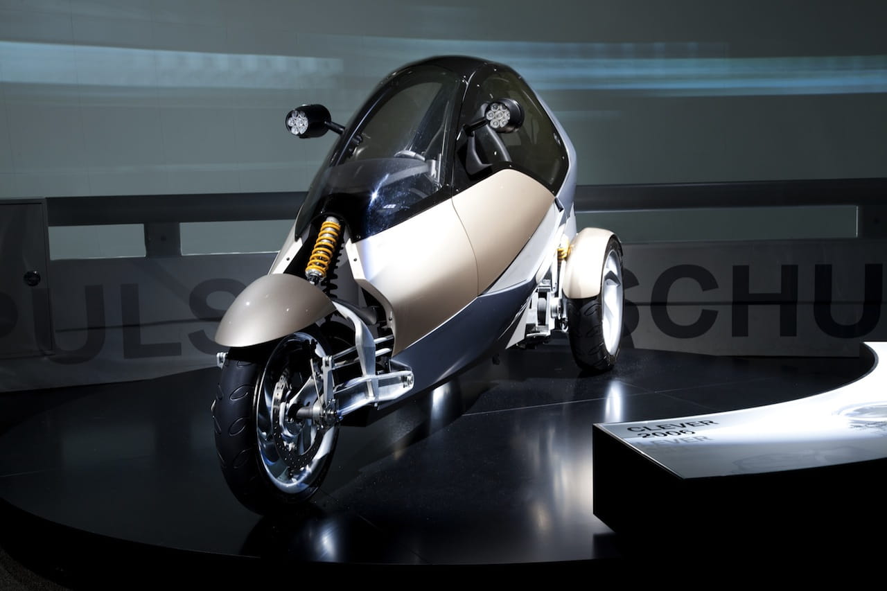 Por su lado el Clever o “Compact Low Emission Vehicle for Urban Transport” (“Vehículo compacto de bajas emisiones para transporte urbano”) es una apuesta que vuelva a poner de actualidad un prototipo presentado en el 2006. Sigue siendo un tres ruedas de 3 metros de largo con capacidad para dos personas.