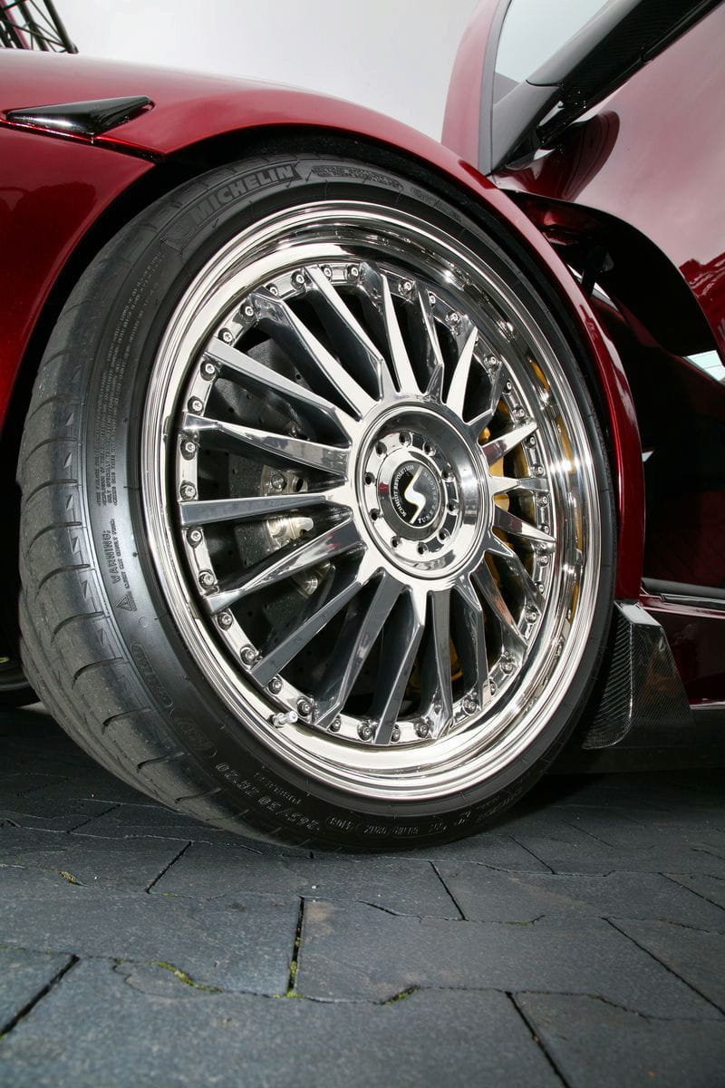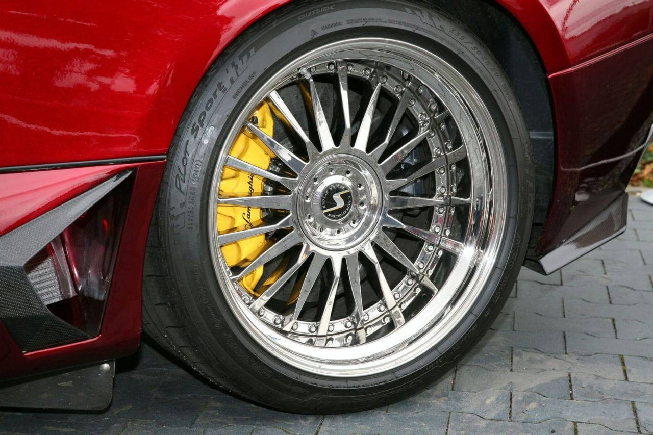 Desde la superficie más exterior del LP 640 JB-R aparecen los detalles exclusivos. La pintura, aunque pudiera parecerlo, es un trabajo único de JB Car Design y no aparece en ningún otro Lamborghini. Junto a ese tono granate se distingue los diferentes accesorios aerodinámicos y pequeños detalles como los “brillantes” que hay en las entradas de aire. El calzado lo forman unas llantas Schmidt de 20 pulgadas y anchos neumáticos Michelin.